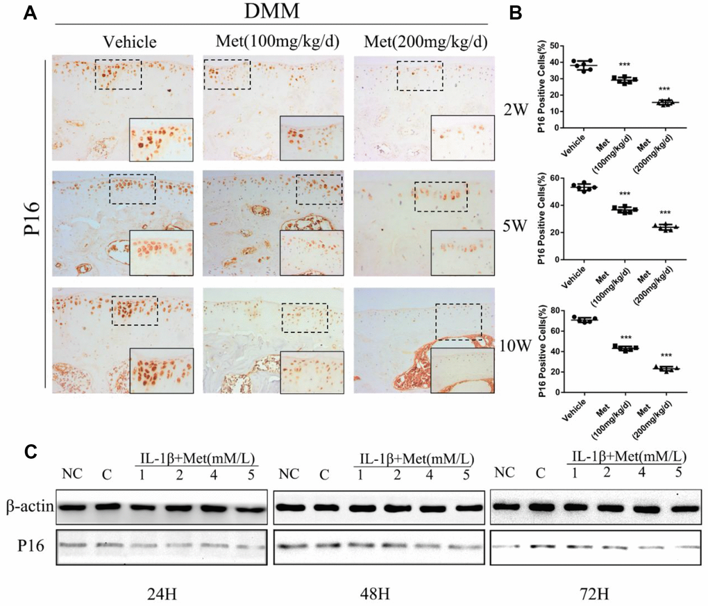 To determine whether metformin was involved in regulating chondrocyte aging in articular cartilage, we determined p16INK4a expression and cellular senescence markers in chondrocytes of DMM mice. The percentage of p16INK4a-positive cells was significantly increased with the progression of articular cartilage degeneration. However, expression of p16INK4a was maintained at lower expression by treatment with metformin (Figure 3A, 3B). To extend these findings, we transiently overexpressed metformin in mice primary chondrocytes. There was a significant increase in chondrocyte viability following metformin overexpression. Western blotting showed that p16INK4a was significantly decreased in a dose-dependent manner in primary articular chondrocytes treated with metformin (Figure 3C). Together, the results showed that metformin treatment decreased cartilage aging both in vivo and in vitro.