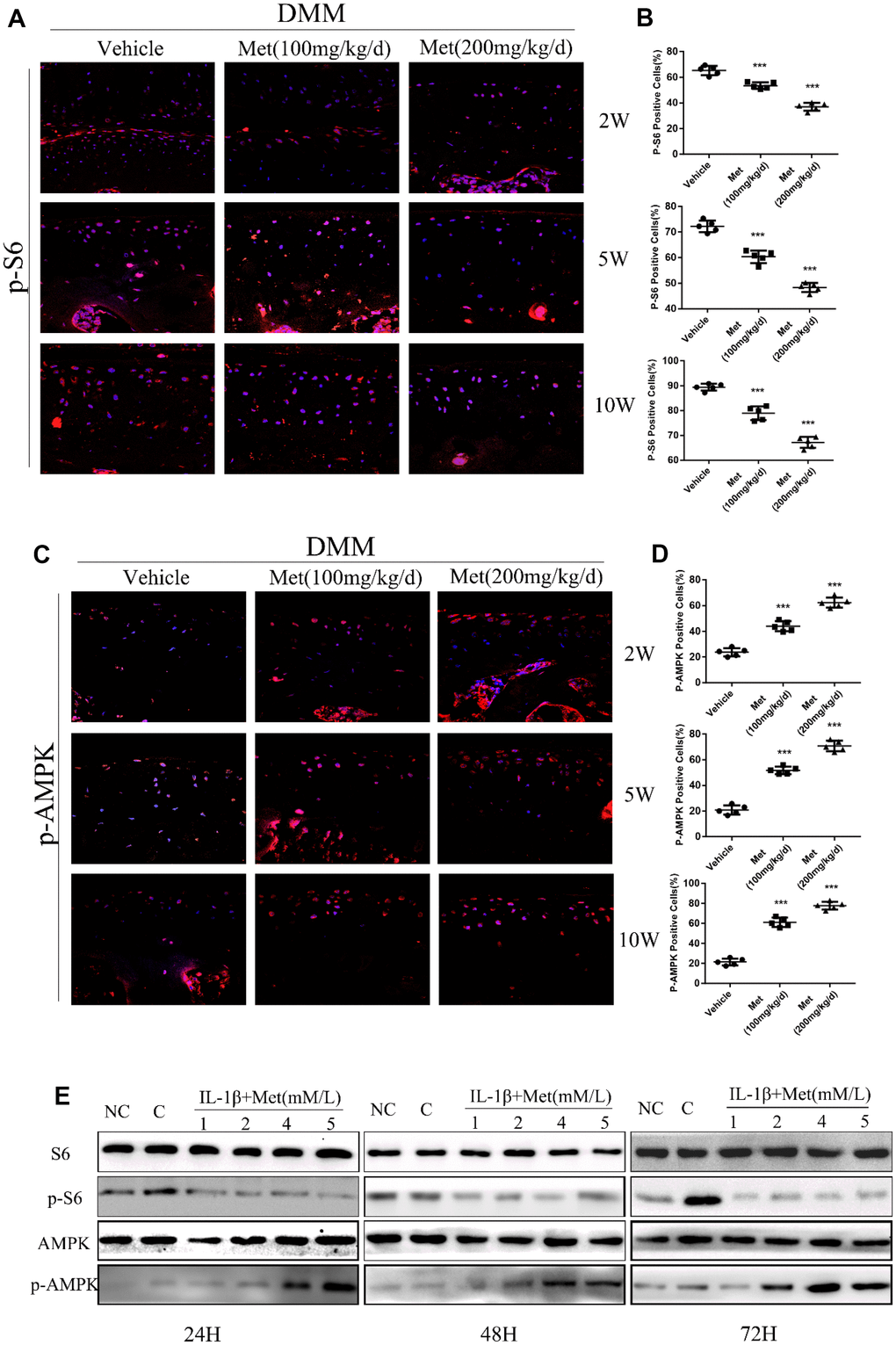 Immunofluorescence staining of our OA model showed that with the increase of metformin concentration, there was increased expression of p-AMPK positive cells, and increased expression of p-AMPK protein in chondrocytes, which showed that metformin treatment activated the AMPK signaling pathway in a dose-dependent manner. However, with an increase of metformin concentration, the expressions of p-S6 positive cells and p-S6 protein in chondrocytes decreased, indicating that the mTORC1 signaling pathway was significantly inhibited. We confirmed in animal experiments and cell experiments as well as cartilage explant experiments that metformin had a positive effect on the treatment of OA, both in vivo and in vitro.