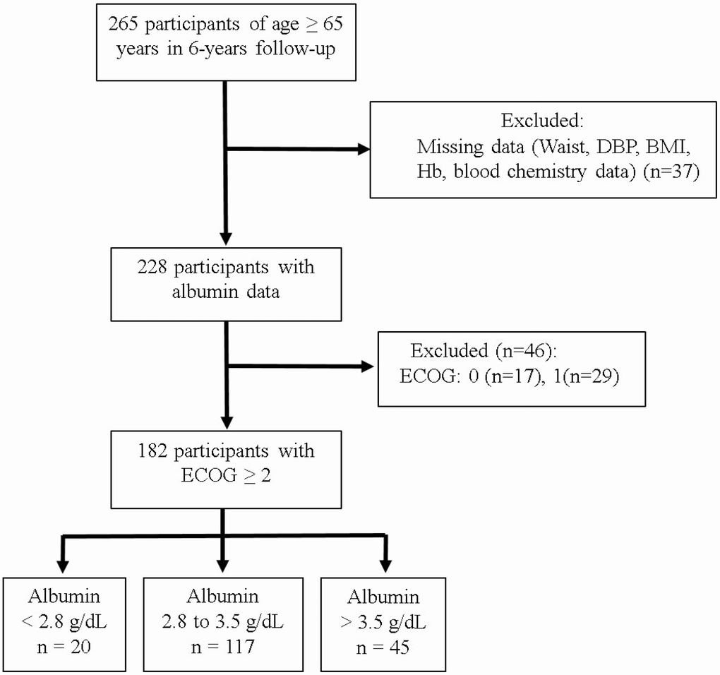 In total, 228 individuals (42% men) living in eight different long-term care facilities met our inclusion criteria for BMI and serum albumin at the end of a 6-year follow-up period. Among those, 46 (20%) were excluded due to ECOG scores <2 (Figure 1). Of the remaining 182 participants, 20 (11%) had serum albumin levels <2.8 g/dL, while 117 (64%) had serum albumin levels of 2.8–3.5 g/dL and 45 (25%) had levels >3.5 g/dL. Table 1 lists the basic characteristics of the participants segregated based on their albumin levels. The total number of deaths during follow-up was 139 (76%). The mean age of the participants with an ECOG score ≥2 was 78.8 years (57% women). Compared with the other two groups, participants with albumin levels <2.8 g/dL were older and had a significantly lower waist circumference (WC) and BMI as well as lower hemoglobin, albumin, total cholesterol, and triglyceride (TG) levels.