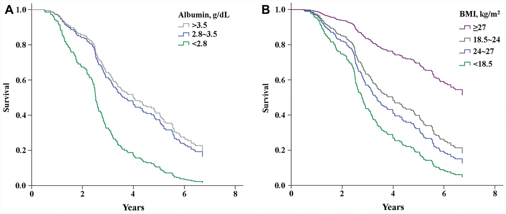 Multivariable-adjusted Cox proportional hazards models were used to estimate HRs and 95% CIs. Anthropometric and laboratory data were categorized as follows: systolic blood pressure (≤120, 121–139, and ≥140 mmHg); DBP (≤80, 81–89, and ≥90 mmHg), BMI (≤18.5, 24–27, and ≥27 kg/m2); hemoglobin (male: <13.7 and ≥13.7 g/dL; female: <11.1 and ≥11.1 g/dL), albumin (>3.5, 2.8–3.5, and <2.8 g/dL), fasting glucose (≤100, 101-125, and ≥126 mg/dL), total cholesterol (>200 and ≤200 mg/dL), TG (>150 and ≤150 mg/dL), HDL-C (male: >40 and ≤40 mg/dL; female: >50 and ≤50 mg/dL), BUN (>26 and ≤26 mg/dL), creatinine (male: >1.3 and ≤1.3 mg/dL; female: >1.1 and ≤1.1 mg/dL), and uric acid (male: >7.5 and ≤7.5 mg/dL; female: >6.5 and ≤6.5 mg/dL); and ECOG score (2, 3, and 4). ANOVA was used for continuous variables and the chi-square test was used for categorical variables at different albumin levels. Effects of albumin and BMI levels on mortality were determined using the Kaplan-Meier method. The mortality risk corresponding to different BMIs and albumin levels was also calculated. All statistical tests were two-sided, and values of P <0.05 were considered significant. All statistical analyses were performed using the PC version of the SPSS statistical software (version 21.0; SPSS Inc., Chicago, IL, USA).