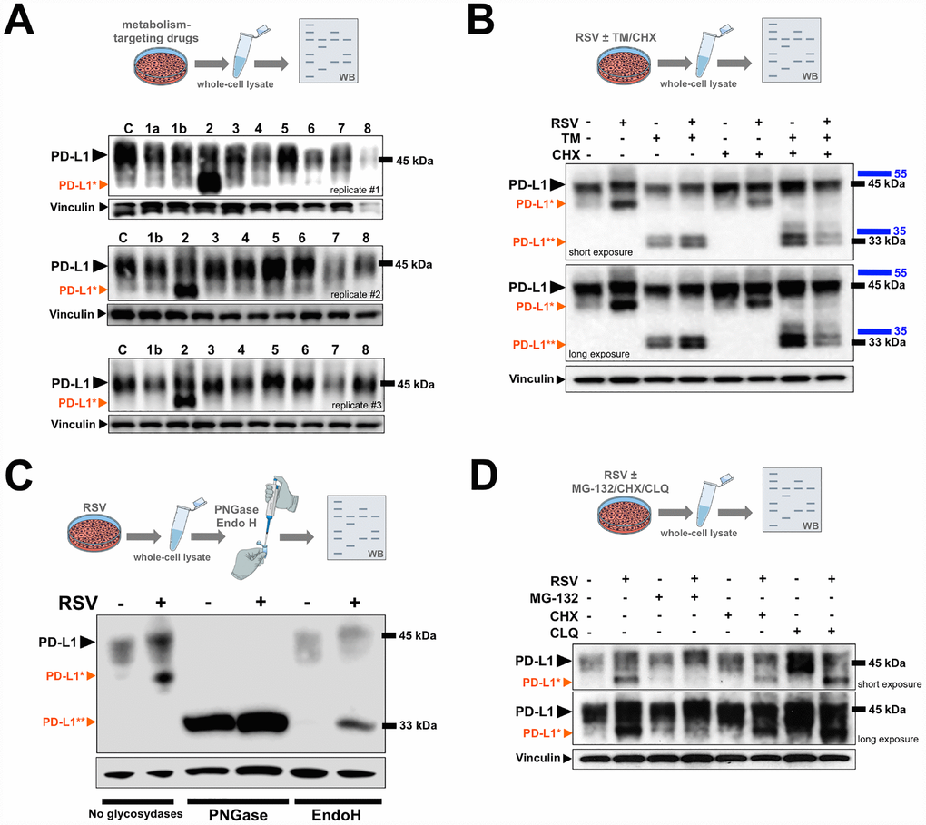 Previous studies have unambiguously demonstrated that the ~45 kDa form of PD-L1 corresponds to the fully N-glycosylated mature protein [41–43]. As glycosylation of proteins often generates a heterogeneous migration pattern on immunoblots, such as that observed for PD-L1 in response to RSV treatment, we hypothesized that RSV might promote the accumulation of an aberrantly-glycosylated form of PD-L1. To test this, we re-evaluated the expression of PD-L1 in cells cultured with the antibiotic tunicamycin, which blocks N-linked glycosylation by inhibiting the enzyme N-acetylglucosamine phosphotransferase, responsible for the initial steps in protein glycosylation (Figure 1B). A significant portion of the major ~45-kDa PD-L1 band was reduced to ~33 kDa upon tunicamycin treatment in control (RSV-untreated) cell cultures, which is known to represent the non-glycosylated form of PD-L1. The molecular weight shift to non-glycosylated PD-L1 was more evident in cells co-treated with RSV and tunicamycin, and the addition of tunicamycin also prevented the accumulation of the lower PD-L1 band that appeared in response to RSV as a single agent (Figure 1B). Also, in the presence of the protein synthesis inhibitor cycloheximide, the turnover of the RSV-induced smaller species of PD-L1 and of the non-glycosylated (~33 kDa) form of PD-L1 appeared to be faster than that of the fully-glycosylated (~45 kDa) form.