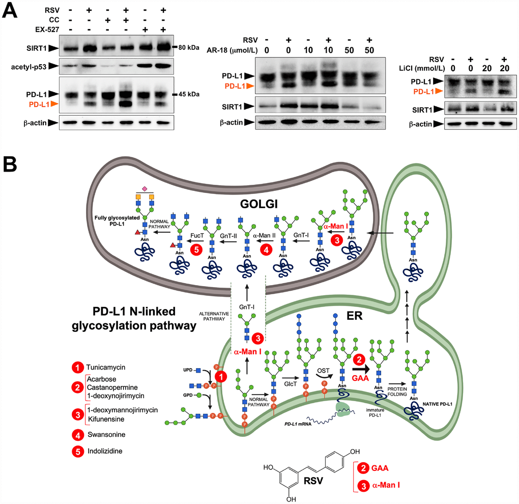 To substantiate that the RSV-induced aberrant glycosylated form of PD-L1 occurred concomitantly with the expected mode(s) of action of RSV, we first confirmed the well-known capacity of RSV to induce the endogenous expression of SIRT1 protein [42–44] (Figure 2A, left panels). Likewise, consistent with the ability of RSV to bind and inhibit histone HDAC enzymes [45, 46], RSV-treated JIMT-1 cells also showed increased p53 acetylation at lysine 382 [47]. The effects of RSV on PD-L1 glycosylation were neither prevented by the concurrent presence of the AMPK inhibitor compound C, nor by co-treatment with the SIRT1 inhibitor EX-527 [48] (Figure 2A, left panels). Moreover, the GSK3β inhibitors AR-18 (Figure 2A, middle panels) and LiCL (Figure 2A, right panels) failed to reverse the RSV-induced migration pattern of PD-L1, thereby ruling out the possibility that RSV might indirectly disrupt N-linked glycosylation through GSK3β activation [49] (Figure 2A, right panels).