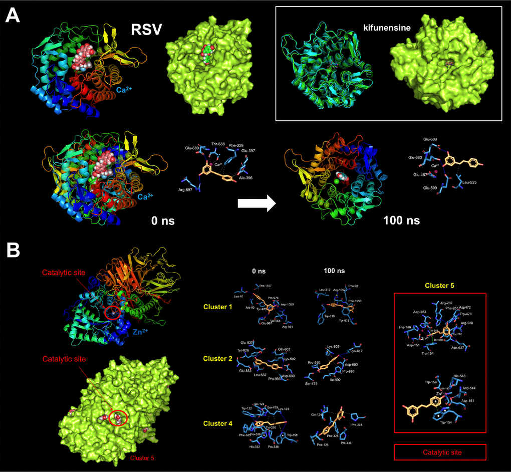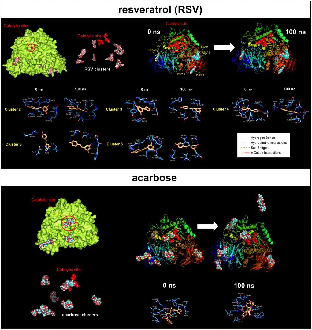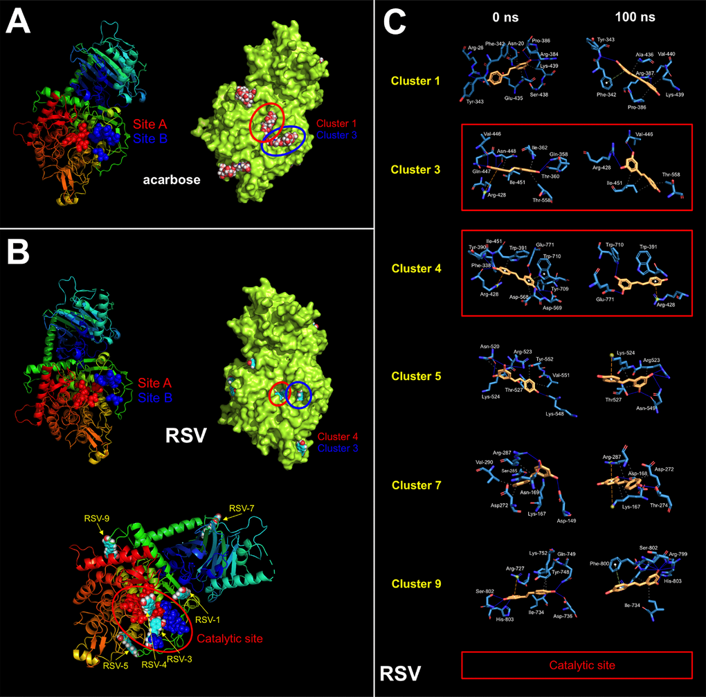 These findings are consistent with a direct (and SIRT1-, AMPK-, GSK3β-independent) effect of RSV on the PD-L1 N-linked glycosylation machinery (Figure 2B). Indeed, RSV treatment notably mimicked the ability of inhibitors blocking N-linked (but not O-linked) glycosylation (e.g., swainsonine, castanospermine, kifunensin, or 1-deoxymannojirimycin) to alter the migration pattern of glycosylated PD-L1 on SDS-PAGE [50]. Specifically, the capacity of RSV to operate as an antiglycation agent via direct inhibition of α-glucosidase I (GAA) [51–54] and/or α-mannosidase I (α-Man I) [55, 56] would suffice to explain the ability of RSV to generate an Endo H-sensitive, high-mannose N-linked glycan form of PD-L1 in the ER (Figure 2B). In an attempt to provide a computational explanation for the inhibitory activity of RSV against GAA, we performed molecular docking and molecular dynamics (MD) assays of RSV against high-resolution crystal structures of the yeast (4J5T [57]) and human (5NN4 [58]) forms of GAA. RSV was predicted to occupy the catalytic site of yeast GAA with a higher binding energy than that predicted for acarbose, a well-known competitive inhibitor of GAA [59–63] (Figure 3A–3C; Supplementary Figure S1; Supplementary Table S1). Conversely, several RSV clusters were predicted to interact with enzymatic pockets distant to the active site of human GAA (Figure 4, top panels), which was accurately predicted to be occupied by acarbose (Figure 4, bottom panels; Supplementary Table S2). When we extended the in silico studies to α-Man I (i.e., ER 1,2-α-mannosidase (5KIJ) [64]), the sole RSV cluster predicted to interact with α-Man was found to occupy the catalytic site of the enzyme and exhibited a binding energy even higher than that predicted for kifunensin, a well-known pharmacological inhibitor of α-Man I [65, 66] (Figure 5A; Supplementary Table S3 ). Although the generation of a homology model of α-Man II predicted the ability of numerous clusters of RSV to interact with several enzymatic pockets including the active site (Figure 5B), the energy binding was lower than that predicted for α-Man I. Considering both the trajectories and the solvation/binding free energy differences (Supplementary Figure S2) of the different RSV-enzyme complexes following MD simulations up to 100 ns, the computational behavior of RSV was compatible with that of a non-competitive inhibitor bound to allosteric sites in the case of human GAA and of a competitive inhibitor capable of stably occupying the catalytic site in the case of human α-Man I.
