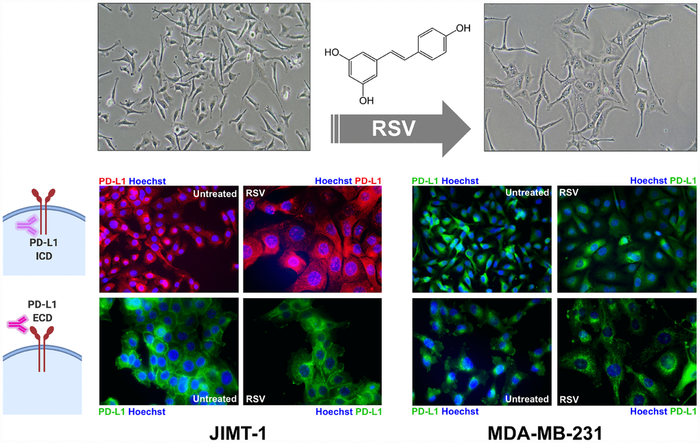 Here, we took advantage of the JIMT-1 cell line, a unique model of highly-aggressive basal-like/HER2-positive breast cancer naturally overexpressing the immunosuppressive molecule PD-L1 with 100% of the cells positive for PD-L1 [40], to explore the potential regulatory effects of mechanistically diverse metabolism-targeting drugs on PD-L1. By combining biochemical, computational, and microscopy approaches with label-free monitoring of T-cell activation, we provide the first evidence that the dietary polyphenol resveratrol (RSV) can directly target PD-L1 glycosylation and dimerization to enhance anti-tumor T-cell immunity.