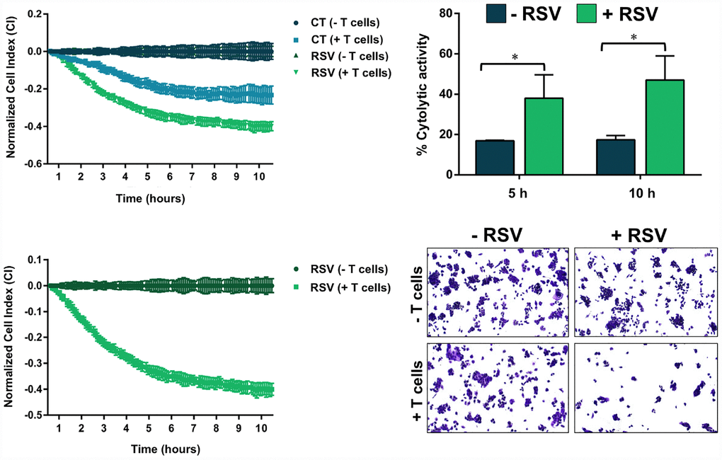 Finally, we questioned whether RSV-induced abnormal glycosylation of PD-L1 would increase the susceptibility of basal-like/HER2+ breast cancer cells to T-cell elimination. To do this, we used an impedance- based assay (xCELLigence system) for real-time and label-free assessment of T-cell-mediated killing of PD-L1-expressing JIMT-1 cells [69, 71]. Briefly, impedance (or opposition) to an electric current occurs when adherent (tumor) cells bind to electrode plates; conversely, electrical impedance is reduced when tumor cells detach following killing, which can be measured by the real-time cell analyzer. The addition of T-cells in suspension over a monolayer of adherent tumor cells does not influence the impedance measurements as they do not contact with the electronic sensor; however, we could specifically detect T-cell activation events as the induction of T-cell-mediated tumor cell death results in morphological and detachment events that can readily be detected via changes in impedance. At a T-cell-to-cancer cell ratio of 5:1, we observed cytolytic activities as low as 15–17% following the addition of T-cells to JIMT-1 cells (Figure 7). When JIMT-1 cells were pre-treated with RSV before exposure to T-cells, we observed a significantly more robust cytolytic activity that reached >50% of the tumor cell population (Figure 7).
