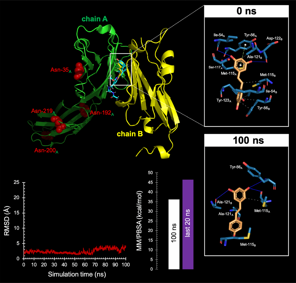 The strong exacerbation of the cytotoxic activity of T-cells against RSV-treated cancer cells raised the suspicion that additional PD-L1-targeted RSV mechanisms of action might be involved. We speculated that such non-mutually exclusive mechanisms might involve RSV binding to the dimerization surface of PD-L1, which is the same employed by PD-L1 to interact with PD-L1 [71–77]. Computer-aided docking/MD simulations predicted the capacity of RSV to occupy the cavity formed by two PD-L1 monomers (ΔG=-9.252 kcal/mol) in a manner closely mimicking that of BMS-202 (ΔG=-11.11 kcal/mol), a small-molecule capable of inhibiting the PD-1/PD-L1 interaction by inducing PD-L1 dimerization through the PD-1 interacting surface [71, 75] (Figure 8, top). The interacting mode of RSV with the dimeric PD-L1 complex included the key contribution of Ile54, Tyr56, Met115, Ala121, and Tyr123 residues on both monomers. An analysis of the RSV trajectory docked to the PD-L1 dimerization interface during a 100 ns period revealed a less than 5Å displacement compared with its initial position at the PD-L1 interaction interface (Figure 8, bottom). These findings, together with solvation binding energies as high as 45 kcal/mol, provided computational insight into the putative capacity of RSV to target PD-L1 dimerization and block the PD-1/PD-L1 interaction. When we examined monomeric and dimeric conformations of PD-L1 by native gel electrophoresis, the presence of appreciable amounts of PD-L1 dimer was apparent in RSV-treated cells whereas the monomeric form of PD-L1 was the major species in untreated control cells (Figure 8, bottom).