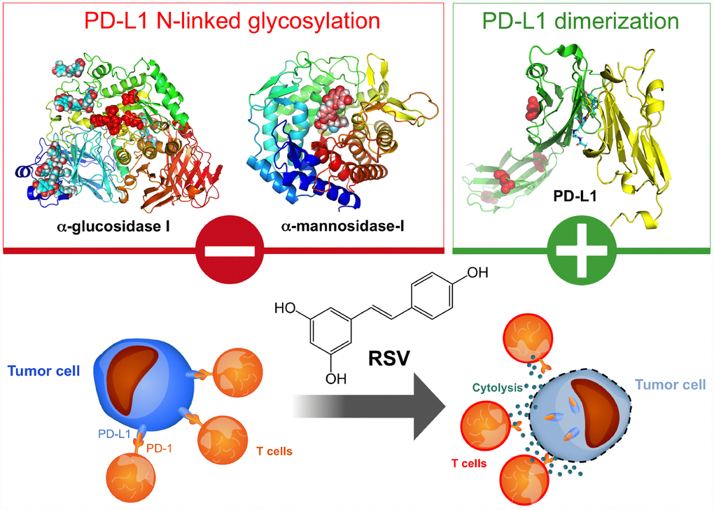 We provide the first demonstration that RSV targets the immune evasion capacities of cancer cells by directly disrupting N-glycan branching and promoting dimerization of PD-L1, thereby impeding the correct localization of PD-L1 to the plasma membrane, preventing the PD-1 interaction surface of PD-L1 and, consequently, increasing the susceptibility of biologically aggressive cancer cells to T-cell-mediated cell death (Figure 9).