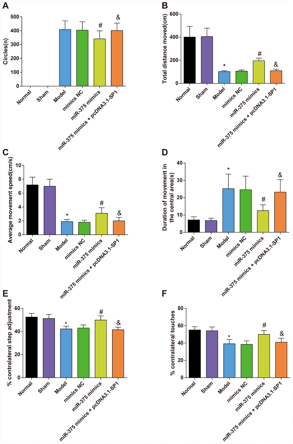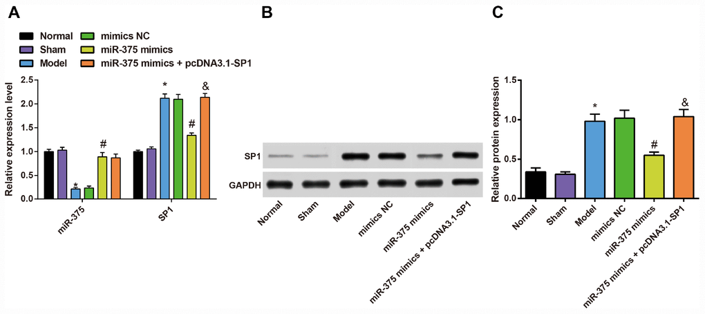 Outcomes of the open field test reflected that there was no significant difference between the normal group and the sham group in the total distance moved, the average movement speed and duration of movement in the central grid in one minute of rats (all P > 0.05). Compared with the normal group, the total distance moved and the average movement speed decreased significantly while the duration of movement in the central grid in one minute increased significantly in the model group (all P < 0.05). However, there was no significant difference among the model group, the mimics NC group and the miR-375 mimics + pcDNA3.1-SP1 group in the total distance moved, the average movement speed and duration of movement in the central grid in one minute (all P > 0.05). In contrast to the mimics NC group, the total distance moved and the average movement speed increased significantly while the duration of movement in the central grid in one minute decreased significantly in the miR-375 mimics group (all P < 0.05). Relative to the miR-375 mimics group, the total distance moved and the average movement speed decreased significantly while the duration of movement in the central grid in one minute increased significantly in the miR-375 mimics + pcDNA3.1-SP1 group (all P < 0.05; Figure 1B–1D).