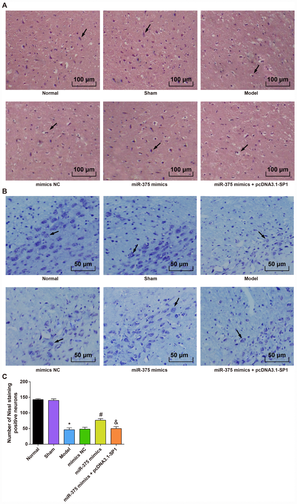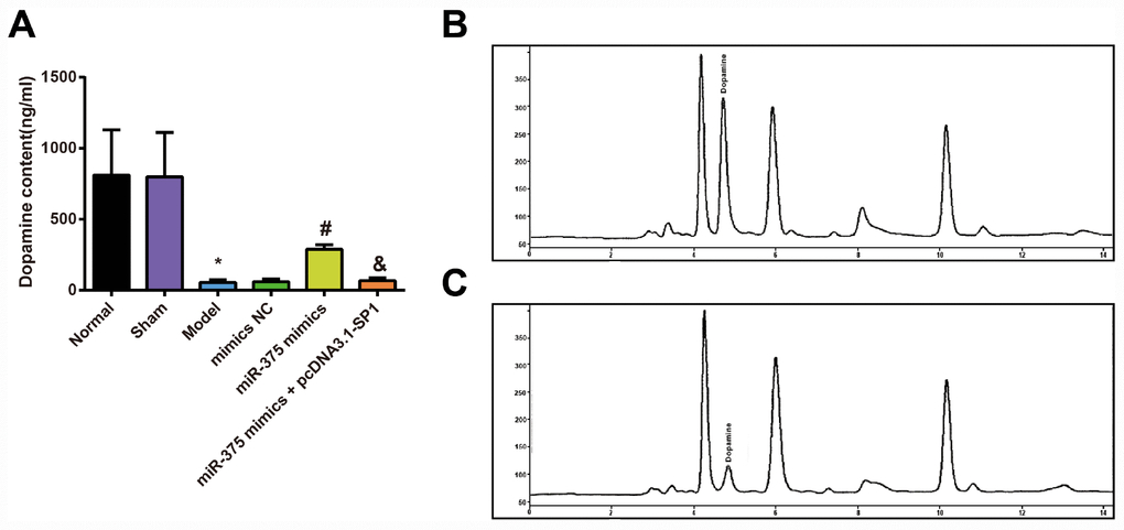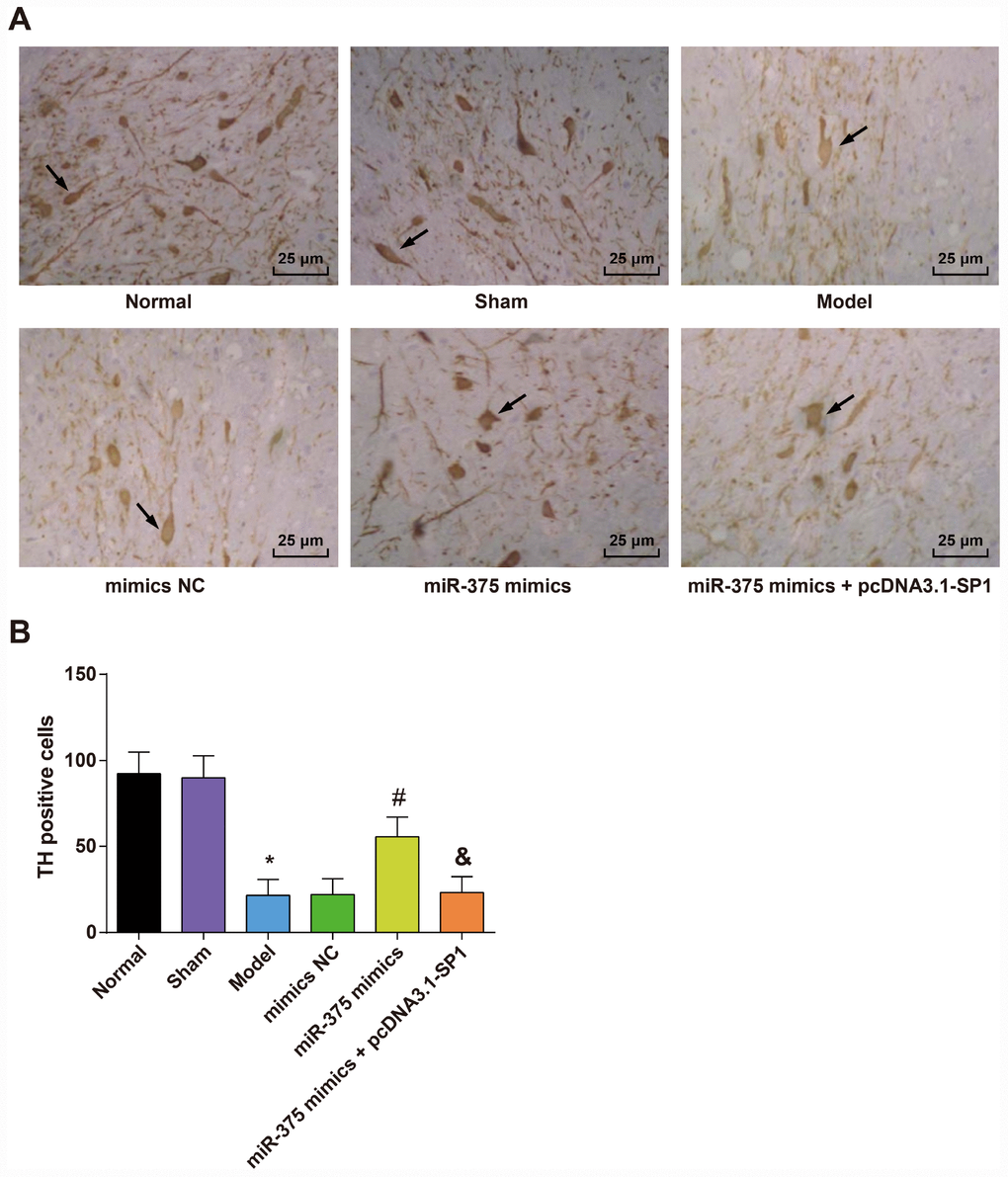 HE staining (Figure 2A) showed that cells in SNpc region were dense and arranged neatly in the normal group and the sham group, and cells in SNpc region of the model group and the miR-375 mimics + pcDNA3.1-SP1 group were significantly decreased with connective tissue proliferation. In the miR-375 mimics group, cells in SNpc region were dense, arranged in order and clear in interstitium.