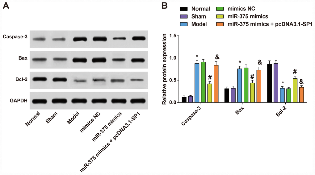 The proteins from cells were extracted and the protein concentrations were determined referring to the instructions of the bicinchoninic acid assay kits (Beyotime Institute of Biotechnology, Shanghai, China). The proteins were separated by 10% sodium dodecyl sulfate polyacrylamide gel electrophoresis and transferred to a nitrocellulose membrane. Subsequently, the protein samples were transferred to polyvinylidene fluoride membranes and blocked with 5% bovine serum albumin at 4°C. Afterwards, the membranes were added with the primary antibodies to SP1 (1 : 500), Caspase-3 (1 : 500), Bax (1 : 1000), Bcl-2 (1 : 500) (Abcam, Cambridge, MA, USA) and GAPDH (1: 1000) (Millipore Corporation, Bedford, CA, USA) and incubated at 4°C overnight. The membranes were then rinsed with Tris-buffered saline and Tween 3 times. The membranes were incubated with corresponding horseradish peroxidase-labeled secondary antibodies (Abcam, Cambridge, MA, USA) for 1 h at 37°C. An enhanced chemiluminescent solution was used for developing. The gray value of the target band was analyzed by Image J software.