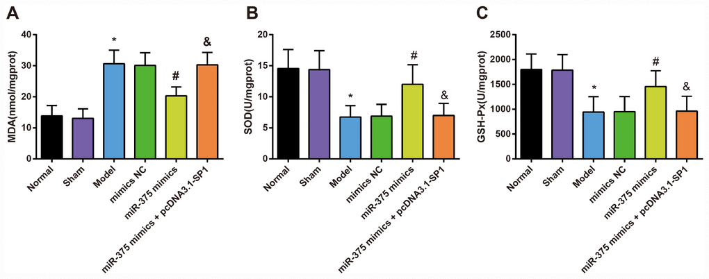 The contents of oxidative stress factors (SOD, GSH-Px and MDA) in the substantia nigra were determined by ELISA to assess the role of up-regulated miR-375 in oxidative stress response of 6-OHDA-induced Parkinson’s disease rats (Figure 6). The results indicated that there was no significant difference in the contents of SOD, GSH-Px and MDA in the substantia nigra between the normal group and the sham group (all P > 0.05). Compared with the normal group, the content of MDA increased significantly while the activities of SOD and GSH-Px decreased significantly in the substantia nigra of rats in the model group (all P < 0.05). There was no significant difference in the contents of SOD, GSH-Px and MDA in the substantia nigra among the model group, the mimics NC group and the miR-375 mimics + pcDNA3.1-SP1 group (all P > 0.05). The content of MDA decreased significantly while the activities of SOD and GSH-Px increased significantly in the substantia nigra of rats in the miR-375 mimics group relative to the mimics NC group (all P < 0.05). Compared with the miR-375 mimics group, the content of MDA was significantly increased, while the activities of SOD and GSH-Px were significantly decreased in substantia nigra of rats in the miR-375 mimics + pcDNA3.1-SP1 group (all P < 0.05). These results mirrored that the elevation of miR-375 was able to attenuate the oxidative stress response in the substantia nigra of rats that induced by 6-OHDA treatment.