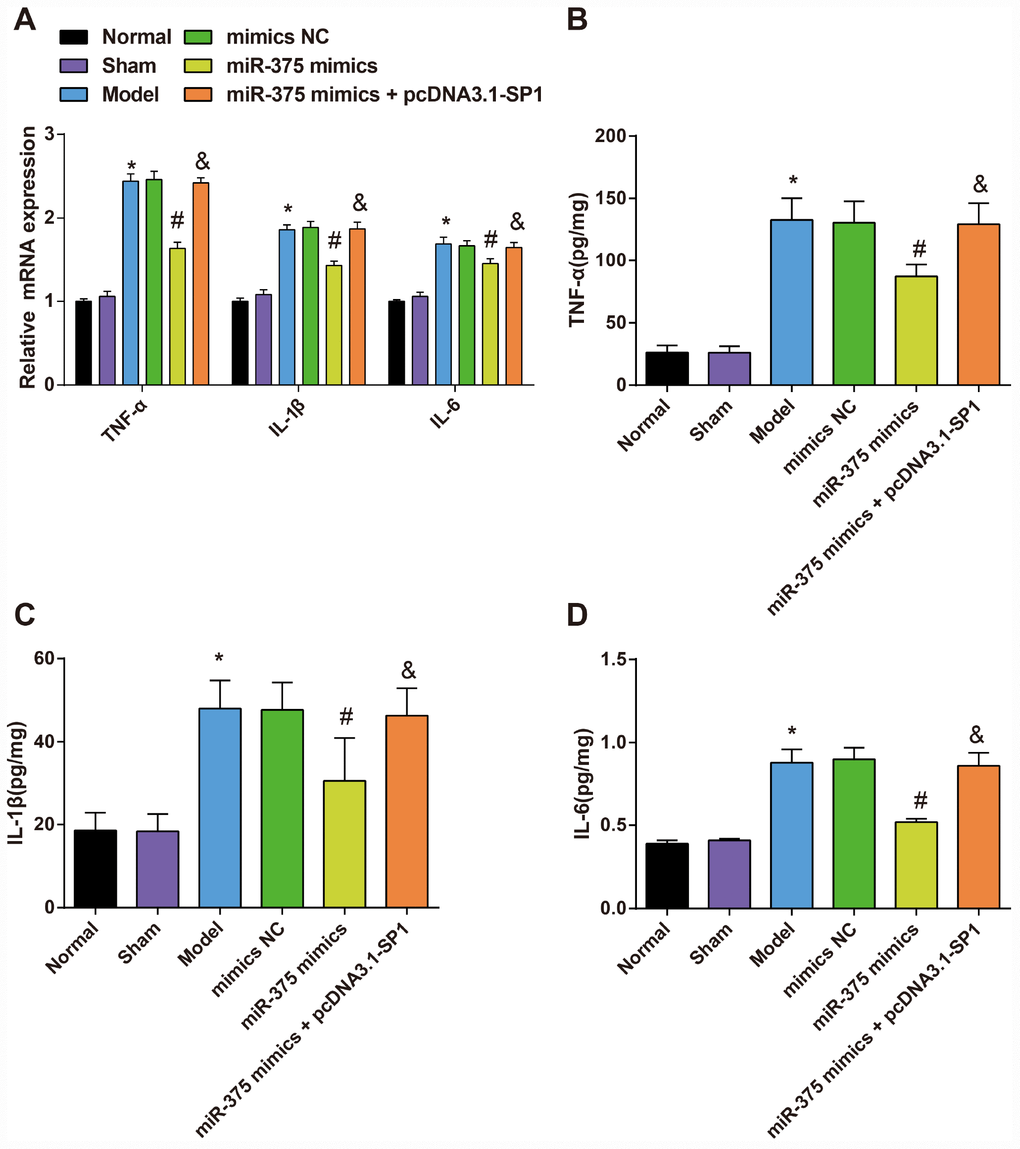 The Trizol method (Takara, Dalian, China) was implemented to extract the total RNA. Nanodrop2000 (Thermo Fisher Scientific, San Jose, CA, USA) was used to determine the concentration and quality of RNA. The complementary DNA (cDNA) was obtained according to the instructions of the reverse transcription kits (DRR047S, Takara, Dalian, China). The obtained cDNA was added with 65 μL diethyl pyrocarbonate (DEPC) and mixed. PCR primer was designed and synthesized by Shenzhen BGI (Shenzhen, China) (Table 1). U6 was taken as the internal reference of miR-375, and glyceraldehyde phosphate dehydrogenase (GAPDH) was taken as the internal reference of SP1, TNF-α, IL-6 and IL-1β. There were six duplicates in each gene of each sample. The 2-ΔΔCt method [42] was used to analyze the ratio relation of target gene expression between the experimental group and the control group: ΔΔCt = [Ct (target gene) - Ct (internal control gene)] experimental group - [Ct (target gene) - Ct (internal control gene)] control group.