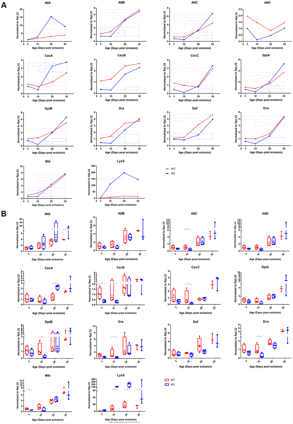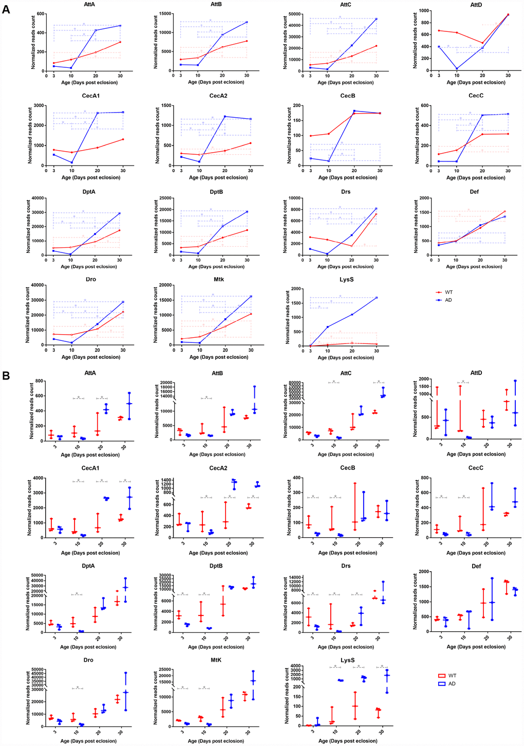 Transcript levels of key differentially expressed innate immunity genes were investigated using RNA-Seq, including 14 AMP genes and LysS, and were validated using qPCR assays. The qPCR result generally recapitulated RNA-Seq data. Expression trends of the aforementioned genes in different age groups were generally consistent with those revealed by transcriptomic analysis (Figure 3A). Quantitative analysis confirmed that expression levels of nearly all AMP genes declined to some extent in the AD group at day 3 and 10. Among these, six AMPs, including AttC, CecB, CecC, DptB, Drs, and Dro, had the most significant differential expression, with log2-fold changes of -1.344, -2.097, -2.750, -2.398, -1.973, and -1.791, respectively. After day 10, AMP expression levels in the AD group rapidly increased. The expression of most AMP genes remained at similar levels to those of the control group, of which CecA and AttA were found elevated on day 20 and 30 with log2-fold changes of 1.250 and 1.255, respectively (Figure 3B). There was a continuously increasing trend in the mRNA level of LysS from day 3 to 30, which was markedly increased relative to control levels, with log2-fold change values of 1.413, 3.636, 3.555, and 3.331, respectively (Figure 3).