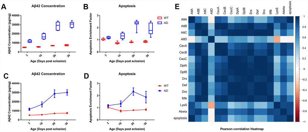 In conclusions, the innate immune systems of AD and WT Drosophila were systematically analyzed using an integrative strategy of transcriptomics and experimental validation in this study. The degree of Aβ production and neuronal apoptosis was also investigated. The expression of AMPs in the WT group increased gradually with time, but the increasing trend of AMP expression was disrupted in the AD group, which exhibited an initial downward trend followed by an upward trend during aging. The occurrence of disordered AMP expression, massive aberrant Aβ aggregates, and significant neuronal apoptosis appeared in sequential order, and correlation analysis further indicated a possible causal relationship among the variables. In conclusion, our study revealed dysregulation of AMP expression in an AD Drosophila model with age, distinct from normal aging. Disordered AMP expression may contribute to AD progression by inducing Aβ deposition. However, the physiological and pathological mechanisms of aberrant AMP regulation and the effects on AD and healthy aging are yet to be discovered.