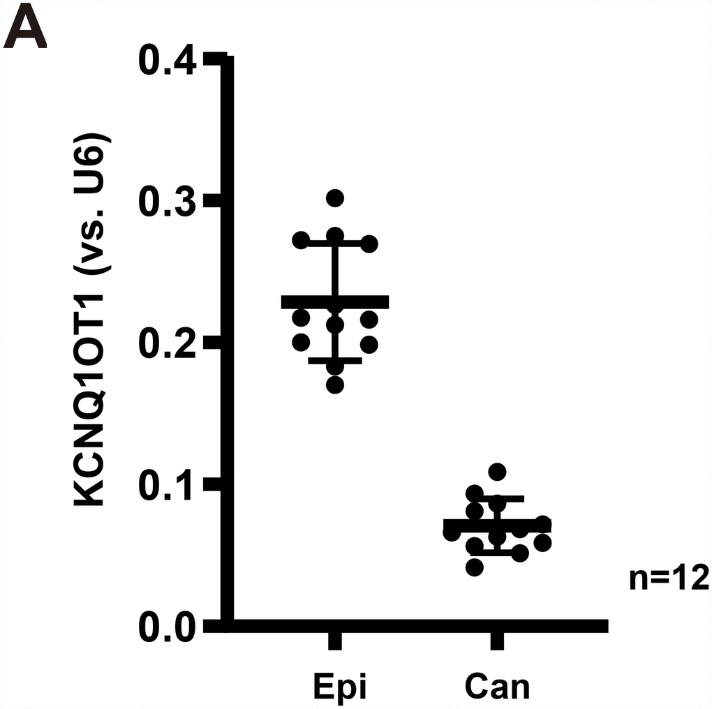 The results show that KCNQ1OT1 levels are significantly downregulated in cancer tissues (“Can”) (Figure 1A), as compared to its levels in the surrounding epithelial (“Epi”) tissues (Figure 1A). Therefore, in GC cancer tissues KCNQ1OT1 downregulation correlated with miR-9 upregulation (see the previous results from same set of tissue samples [7]).