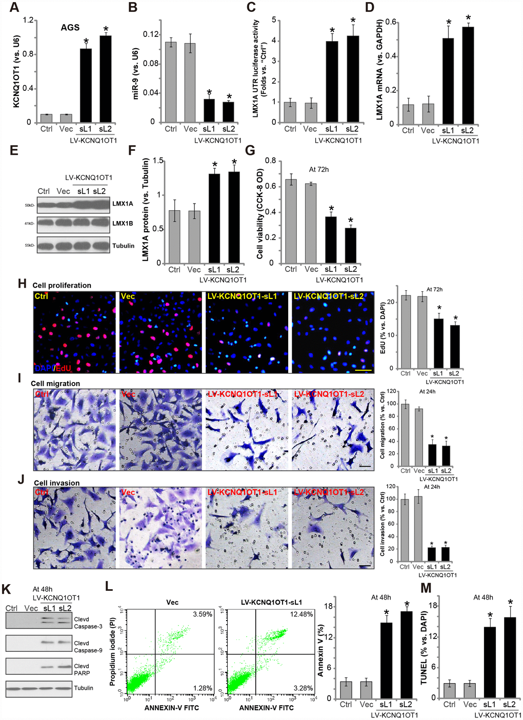 Results showed that AGS cells with LV-KCNQ1OT1 presented with reduced cell viability (vs. control cells, Figure 2G). Furthermore, KCNQ1OT1 overexpression inhibited EdU incorporation (Figure 2H) in AGS cells, indicating proliferation inhibition. “Transwell” and “Matrigel Transwell” assay results, in Figure 2I and 2J, demonstrated that ectopic overexpression of KCNQ1OT1 potently inhibited AGS cell migration and invasion in vitro. Additionally, apoptosis activation was detected in KCNQ1OT1-overexpressed AGS cells, evidenced by cleavages of caspase-3, caspase-9 and poly adenosine diphosphate (ADP) ribose (PARP) (Figure 2K), as well as increased Annexin V staining (Figure 2L) and nuclear TUNEL ratio (Figure 2M). The lentiviral control vector (“Vec”) had no significant effect on the function of AGS cells (Figure 2G–2M).