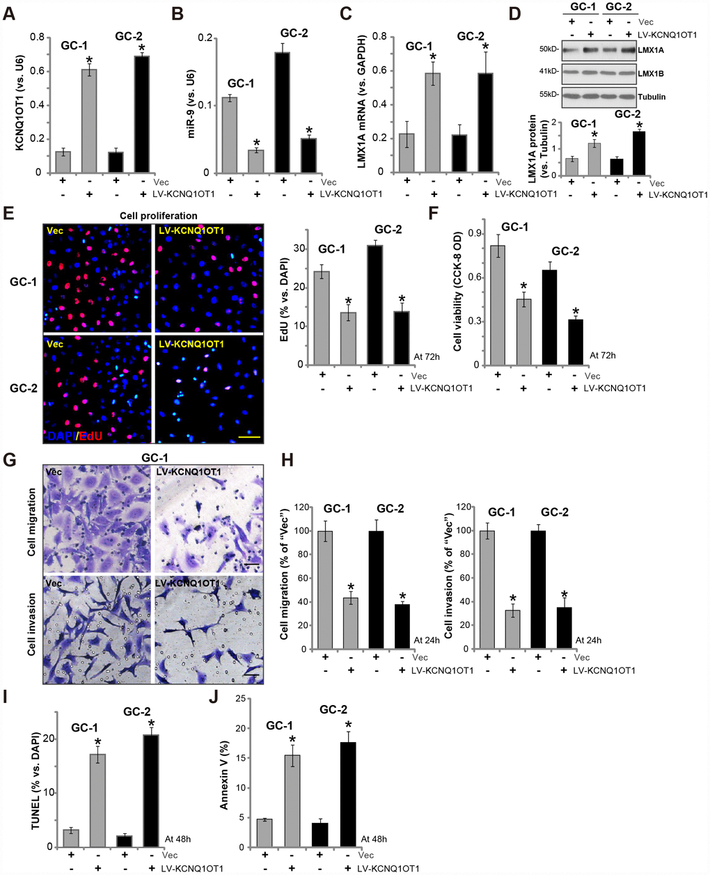 Next, we tested whether LncRNAKCNQ1OT1 exerted similar functions in primary human GC cells. As described previously [7], the primary human GC cells, derived from two independent patients (namely “GC-1/GC-2”), were infected with LV-KCNQ1OT1, which resulted in 5-6 folds increase of KCNQ1OT1 expression (Figure 3A). On the contrary, miR-9 levels were significantly decreased (Figure 3B), with LMX1A mRNA (Figure 3C) and protein (Figure 3D) levels increased in KCNQ1OT1-overexpressed GC cells. LMX1B protein expression was unaffected by KCNQ1OT1 overexpression (Figure 3D).