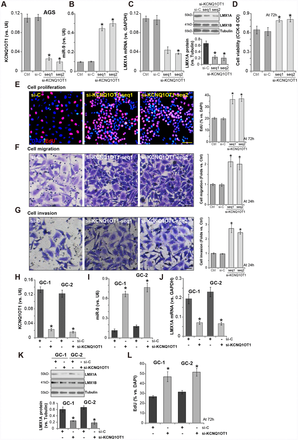 Next, the siRNA strategy was employed to knockdown KCNQ1OT1. Two siRNAs, targeting non-overlapping sequence of KCNQ1OT1 (namely “seq1/seq2” [24]), were transfected to AGS cells. Analyzing KCNQ1OT1 expression by qPCR confirmed that the applied siRNAs resulted in over 60-70% reduction of KCNQ1OT1 expression in AGS cells (Figure 4A). Significantly, KCNQ1OT1 siRNA induced miR-9 upregulation (Figure 4B) and LMX1A mRNA/protein downregulation (Figure 4C). Importantly, KCNQ1OT1-silenced cells presented with increased cell viability (Figure 4D) and EdU staining (Figure 4E), as compared to cells with scramble control siRNA (“si-C”) (Figure 4D, 4E). AGS cell migration and invasion, tested by “Transwell” assay (Figure 4F) and “Matrigel Transwell” assay (Figure 4G), were augmented by KCNQ1OT1 siRNAs as well.