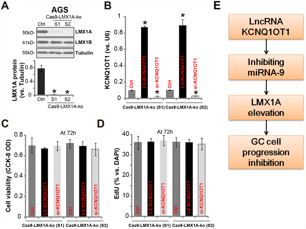 To verify that LMX1A is one target of KCNQ1OT1, we utilized the CRISPR/Cas9 gene-editing method to knockout LMX1A (see our previous study [7]). Two stable LMX1A knockout (“Cas9-LMX1A-ko”) AGS cell lines were established (namely “S1/S2”) [7]. Results in Figure 5A confirmed LMX1A protein depletion in the stable cells, with LMX1B unaffected (Figure 5A). LV-KCNQ1OT1 (see Figure 2) or KCNQ1OT1 siRNA (“seq2”, see Figure 3) were tranduced to the Cas9-LMX1A-ko cells, both significantly altered KCNQ1OT1 expression (Figure 5B). Significantly, neither LV-KCNQ1OT1 nor KCNQ1OT1 siRNA altered viability (Figure 5C) and proliferation (EdU ratio, Figure 5D) in Cas9-LMX1A-ko AGS cells. Thus, in LMX1A-knockout AGS cells KCNQ1OT1 did not change cell viability and proliferation, indicating that LMX1A is one target of KCNQ1OT1.