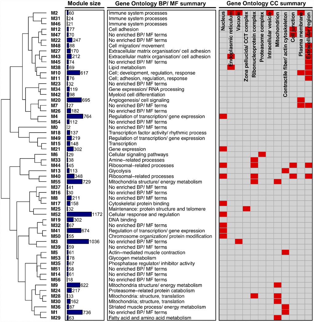 As an initial step in our network-driven pipeline, we modelled interactions among genes in our dataset by constructing a gene co-expression network using the underlying methods of weighted gene co-expression network analysis (WGCNA) [25]. In particular, a signed gene-wise network was assembled in order to sustain a greater distinction between gene ‘activation’ and ‘repression’ [21]. Application of signed-WGCNA subsequently returned an approximately scale-free gene co-expression network comprising 56 distinct groups of genes (i.e. network ‘modules’, labelled M1 - M56), based on the similarity of their expression pattern changes across all samples. Modules ranged in size from 18 genes (M56) to 1172 genes (M52) with the mean and median module sizes being 215 and 88 genes, respectively. The expression profiles of genes within a given module were condensed into a single representative profile of module gene expression, defined as the module eigengene (calculated as the 1st principle component of module gene expression). The module eigengene were then utilised for subsequent downstream analyses at the module level (where appropriate; see ‘methods’). Notably, only two genes were unable to be non-trivially clustered into a particular module and were thus assigned to the module ‘M0’. Gene Ontology (GO) enrichment analysis of module gene sets together with hierarchical clustering of module eigengene (based on their correlation) highlight that, overall, the network portrays a logically organised set of modules which are diverse in aspects fundamental to the innate maintenance/ function of skeletal muscle (Figure 1). Lists of all genes comprising each module can be viewed in Supplementary Table 1, with all enriched GO terms for each network module provided in Supplementary Table 2.