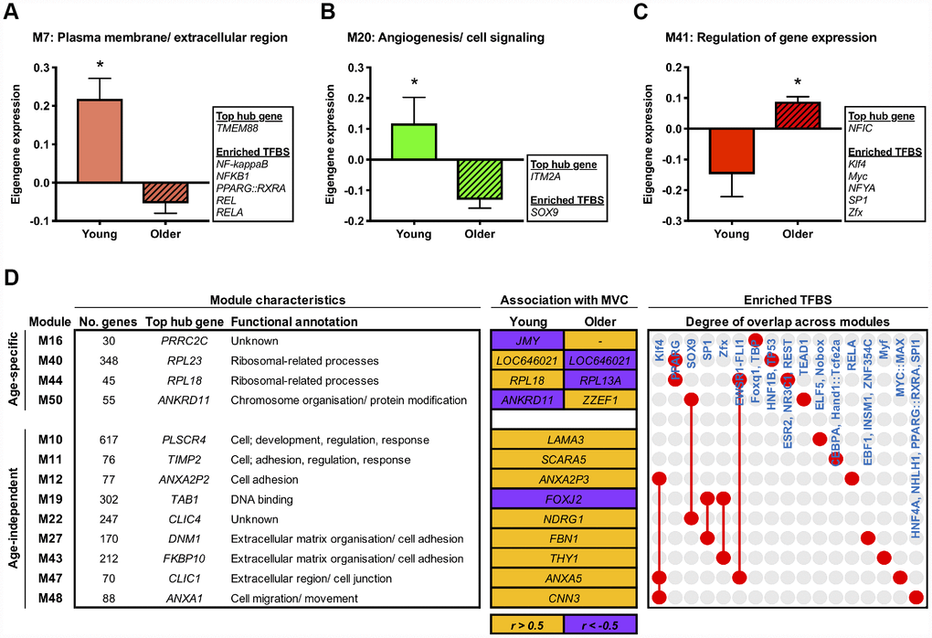 To explore molecular changes that might underpin muscle adaptation to aging per se, we subsequently established gene modules with composite expression altered by age in the basal state. Accordingly, we applied differential analyses to the module eigengene and identified three network modules with an aging-dependent expression profile (FDR < 5%). Two of these modules represent molecular networks downregulated in older muscle, comprising genes enriched for plasma membrane/ ECM (M7) and angiogenesis/ cell signalling (M20) GO terms (Figure 2A and 2B). The third age-related module (M41) represents a molecular network upregulated with aging, containing genes involved in the regulation of gene expression/ transcription (Figure 2C). A complete list of differentially regulated network modules is given in Supplementary Table 3.