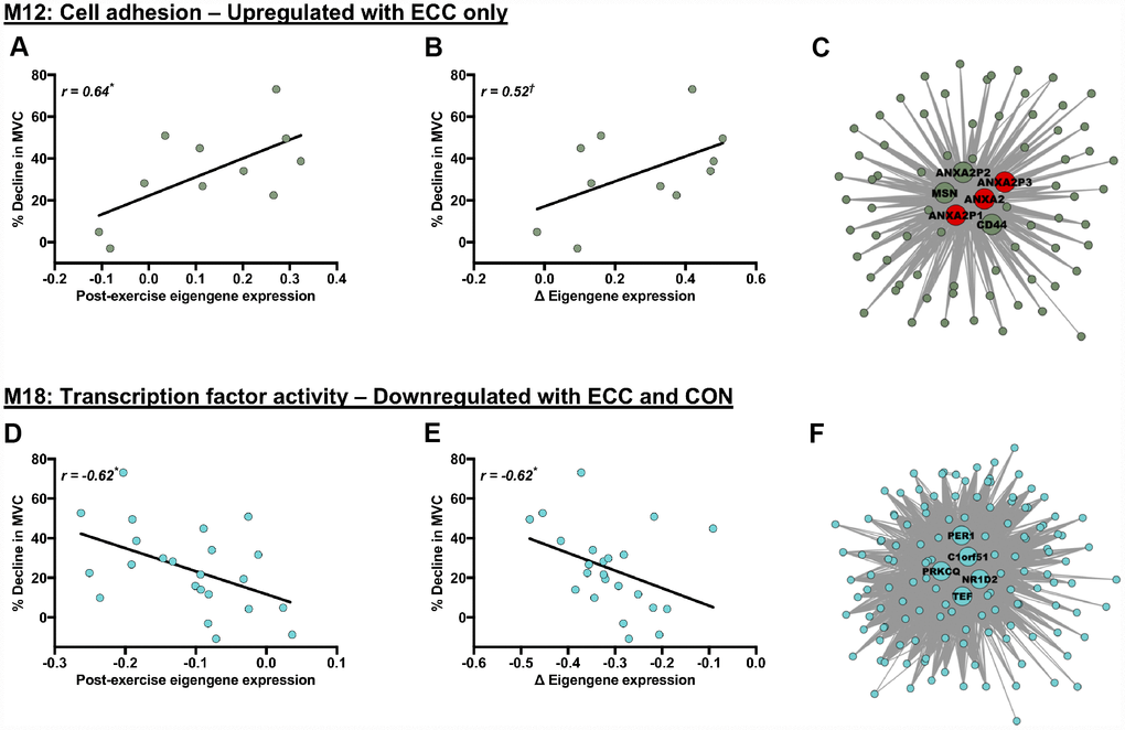 Both acute ECC and CON contractions induced variable declines in MVC 5 h post-exercise, in both young and older individuals. We therefore investigated potential relevance of contraction-regulated modules (as shown in Figure 3) to the acute post-exercise functional response, by correlating each of their specific post-exercise eigengene patterns with the corresponding 5 h post-exercise muscle strength responses (% MVC decline from baseline) (e.g. we correlate post-ECC eigengene patterns with ECC-induced strength declines across age for a module upregulated by ECC per se, etc.). Whilst none of the young- or older-specific, contraction-regulated modules had a post-exercise eigengene pattern that correlated with the respective contraction-induced MVC decline, significant correlation were found for two of the network modules (M12 and M18) regulated by contraction irrespectively of age (Figure 4). M12 is a cell adhesion-related module, which is upregulated by ECC contraction and has a post-ECC eigengene pattern (absolute and delta change) that positively associates with ECC-induced MVC declines (Figure 4A and 4B). M18 is a ‘transcription factor activity’-related module, which is downregulated by both CON and ECC contraction and has a post-contraction eigengene response (absolute and delta change) that negatively associates with contraction-induced strength declines (i.e. pooled ECC- and CON-induced MVC decrements) (Figure 4D and 4E). We then explored whether any hub genes within these two modules (6 for M12, 5 for M18) might also be highly relevant to the acute post-exercise functional response of muscle. None of the hub genes within module M18 fell among the highest ranked module genes based on their individual association (i.e. GS) with acute contraction-induced (post-ECC and -CON) declines in muscle strength (Figure 4E). However, for module M12, 3 of the 6 hub genes were among the top module genes when ranked by their individual association with ECC-induced strength declines and were exclusively Annexin A2 genes (Figure 4C), with known functions in regulating muscle repair.