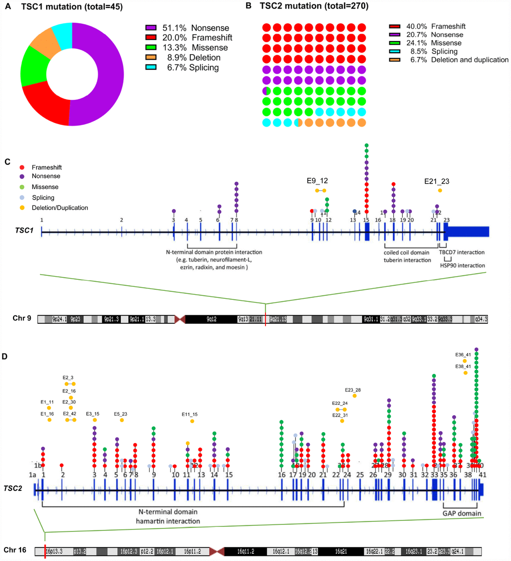To demonstrate the mutation spectrum of Chinese TSC patients, we reviewed all the reported TSC patients in China. A total of 315 alterations were involved for analysis, including 45 TSC1 and 270 TSC2 (Supplementary Table 1). TSC1 patients were more likely to be affected by nonsense mutations than TSC2 patients (51.1% vs. 20.7%, p<0.001), while the frameshift and missense mutations were more common in TSC2 patients (40% vs. 20%, 24.1% vs. 13.3%) (Figure 1A and 1B). Moreover, patients with TSC1 mutation had a significantly higher positive rate of family history compared to those with TSC2 mutation (37.8% vs. 19.6%, p=0.0067) (Table 4). The mutation spectrum of patients with TSC1 or TSC2 gene was next analyzed. For the TSC1 gene, exon 15, 8 and 18 seemed to be the hotspot mutation regions. For the TSC2 gene, we observed alterations in every exon except for exon 25. Specifically, exon 40, 33, and 29 were the most common mutation regions, which accounted for about 30% (60) of all the variants (Figure 1C and 1D).