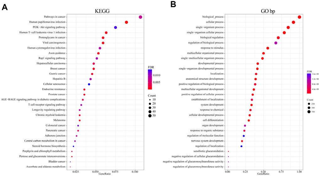 To analyze the function of genomic variant genes, we integrated 1321 amplified or deleted genes and significantly mutated genes identified based on copy number variation. Gene Ontology (GO) biological process and Kyoto Encyclopedia of Genes and Genomes (KEGG) functional enrichment analyses were then performed. The results of the KEGG enrichment analysis revealed that Pathways in cancer, HPV infection, PI3K-Akt signaling pathway, Human T-cell leukemia virus 1 infection, Human cytomegalovirus infection, and numerous other related KEGG biological pathways are important to the development of cancer (Figure 2A). GO terms such as developmental process, positive regulation of cellular process, cell differentiation, and regulation of localization were mainly enriched in the “biological process” category (Figure 2B). These terms were also closely related to the occurrence and development of cancer; that is, these genes exhibiting genomic variation are closely related to cancer.