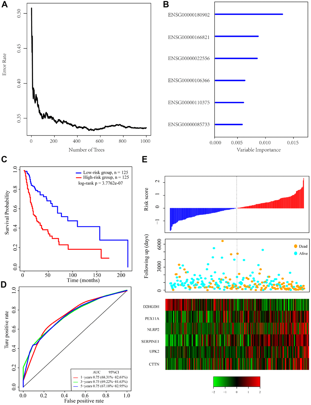 To identify a gene signature, we integrated genomic variant and prognosis-related genes, and then selected the intersection of the groups as candidate genes, which yielded 36 genes. We then used random forests for feature selection. The relationship between error rate and number of taxonomic trees was used to reveal genes with relative importance greater than 0.4 as the final signature (Figure 3A). Ultimately, we identified 6 genes (Table 2). The important order of the out-of-bag scores for the 6 genes is displayed in Figure 3B. A 6-gene signature was established by multivariate COX regression analysis. The Equation 1 is as follows: