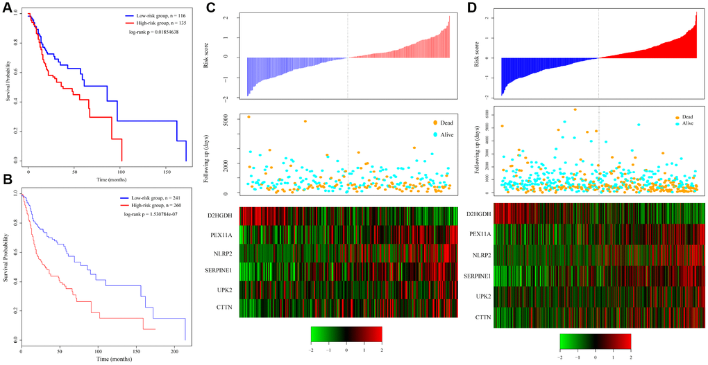 To verify the robustness of the 6-gene signature model, we first calculated a risk score for each sample in the test set. Based on the threshold for the training set, the samples were divided into two groups with significantly different prognoses (Figure 4A). The relationship between the expression of the 6 genes and the risk score was also consistent with the training set (Figure 4C). We similarly applied the model to all TCGA tumor samples and found that the low risk group fared significantly better than the high-risk group (Figure 4B). The relationship between the expression of these 6 genes and the risk score was also consistent with the training set (Figure 4D). Overall, the model effectively provided prognostic classifications with the TCGA datasets.