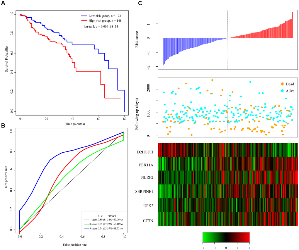 The risk score of each sample was calculated, and the samples were grouped according to the median risk score (cutoff = -0.0236503). The prognoses of the high-risk and low-risk groups significantly differed (Figure 3C). The average 1-, 3-, and 5-year AUC for the 6-gene signature was 0.75 (Figure 3D). High expression of PEX11A, NLRP2, SERPINE1, UPK2 and CTTN was associated with high risk, while high expression of D2HGDH was associated with low risk and was a protective factor.