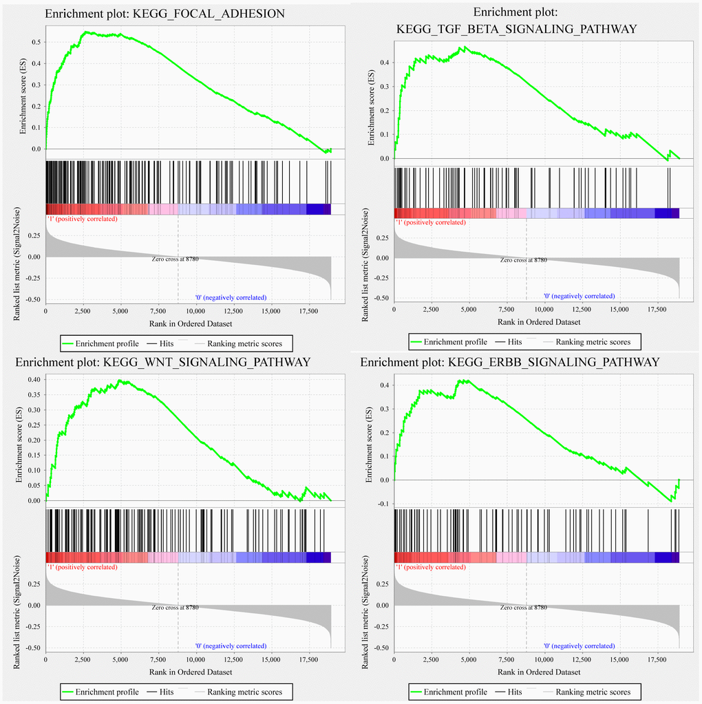 GSEA was used in TCGA training to analyze the pathways significantly enriched in the high-risk and low-risk groups. Twenty enriched pathways were detected (Supplementary Table 3), including focal adhesion, TGF-β signaling pathway, WNT signaling pathway, and ERBB signaling pathway, all of which are closely related to tumor occurrence, development and metastasis. Notably, these pathways are significantly enriched in the high-risk samples (Figure 6).