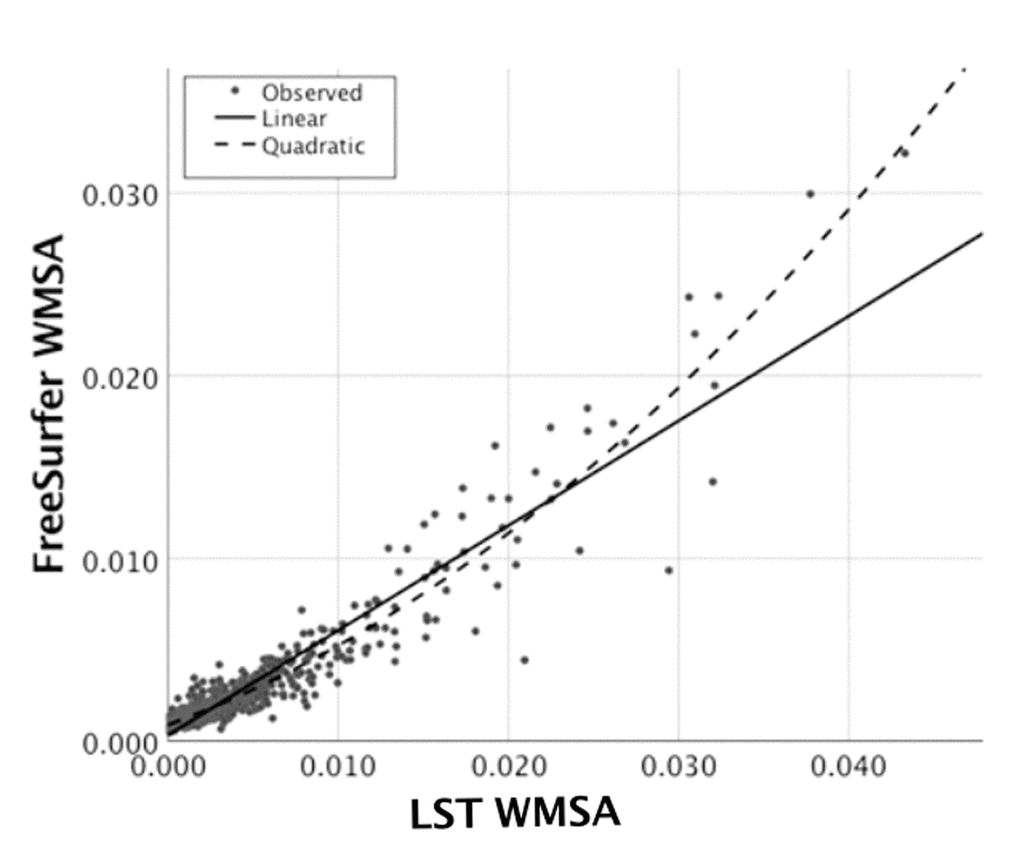 Regarding the association between automatic segmentations of hyperintense and hypointense WMSA, studies are scarce but some data show a close correlation between the two [2, 14]. However, the underlying pathology reflected by hyperintense and hypointense WMSA is not yet entirely understood and they may reflect different microstructural tissue properties. Hypointense WMSA seems to be related to poorer white matter integrity as compared to hyperintense WMSA [14]. On the other hand, hyperintense WMSA may reflect a mix of white matter damage, peri-inflammatory processes, and other pathologies related to increased cerebrovascular and blood-brain barrier permeability [15].