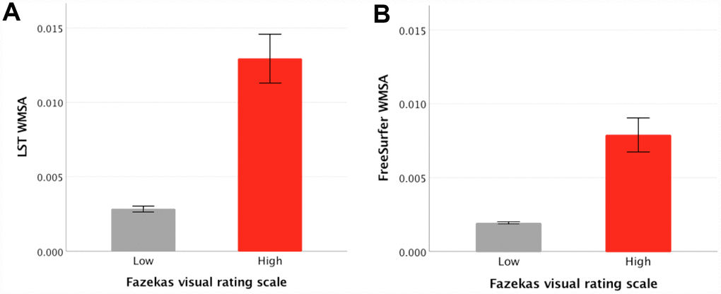 In our population-based cohort of 709 individuals (all 70 years old, 52% female), 15.1% had high Fazekas WMSA burden (i.e. scores 2 and 3) and the rest had low WMSA burden (i.e. Fazekas scores 0 and 1) (Figure 1). After adjusting WMSA volume in milliliters by each participant total intracranial volume (TIV), the mean LST WMSA volume was 0.0043 (SD=0.0054) and the mean FreeSurfer WMSA volume 0.0028 (SD=0.0033) (mean uncorrected WMSA volumes were 6.6 ml (SD = 8.6) for LST and 4.3 ml (SD = 5.3) for FreeSurfer).