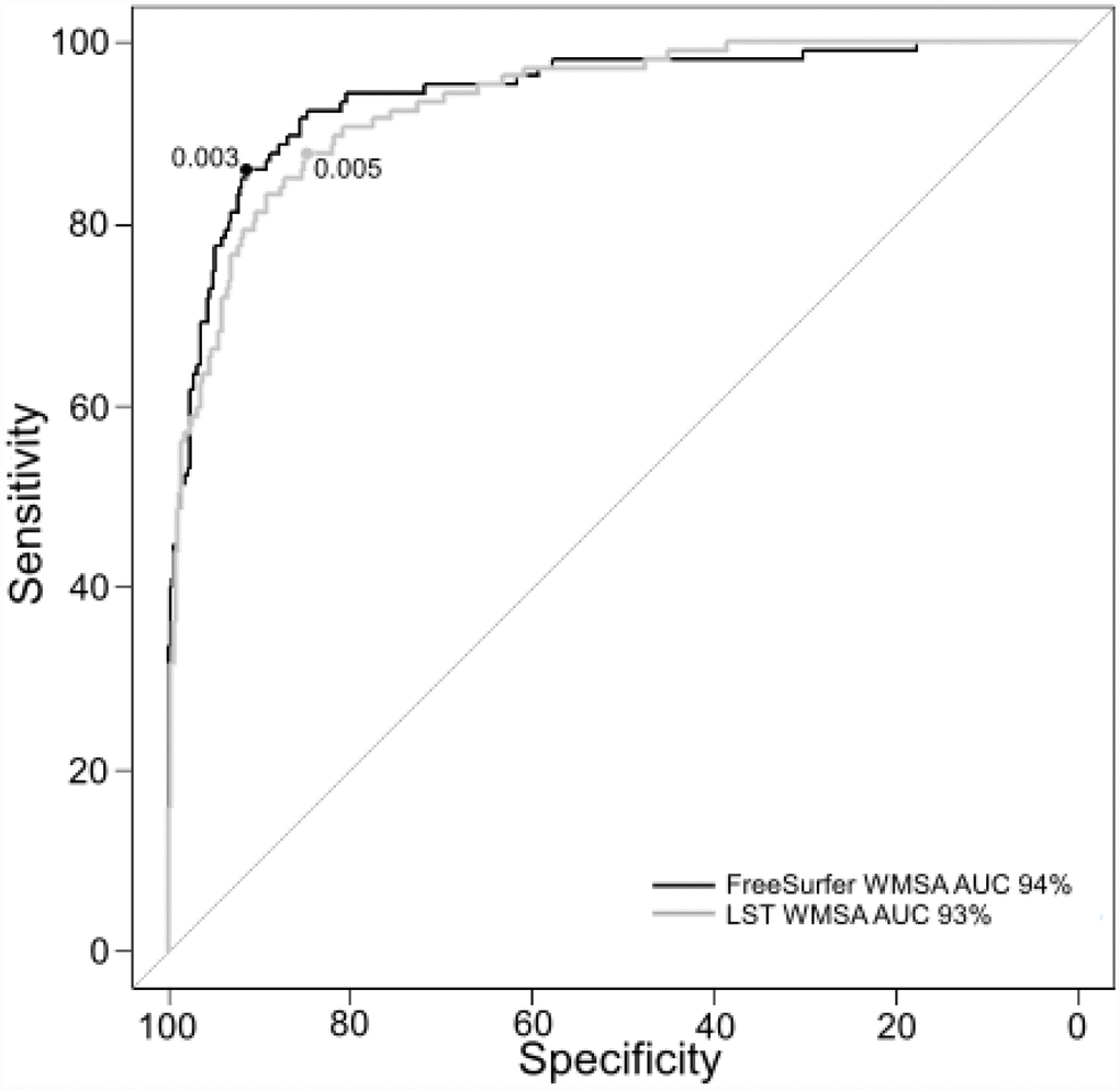 Regarding our secondary aim, we performed a receiver operating characteristic (ROC) curve in order to obtain reliable cut-off values for automatic segmentations of WMSA data from LST and FreeSurfer and identify low and high Fazekas scale WMSA burden. The ROC analyses separating low and high Fazekas WMSA burden categories revealed an AUC value of 93% for LST WMSA, and an AUC value of 94% for FreeSurfer WMSA (Figure 4). The proposed cut-off value to classify low and high Fazekas WMSA burden is 0.00496 for LST WMSA, and 0.00321 for FreeSurfer WMSA. These values are adjusted by the TIV. Corresponding sensitivity and specificity values were 88% and 85% for LST WMSA, and 86% and 91% for FreeSurfer WMSA.
