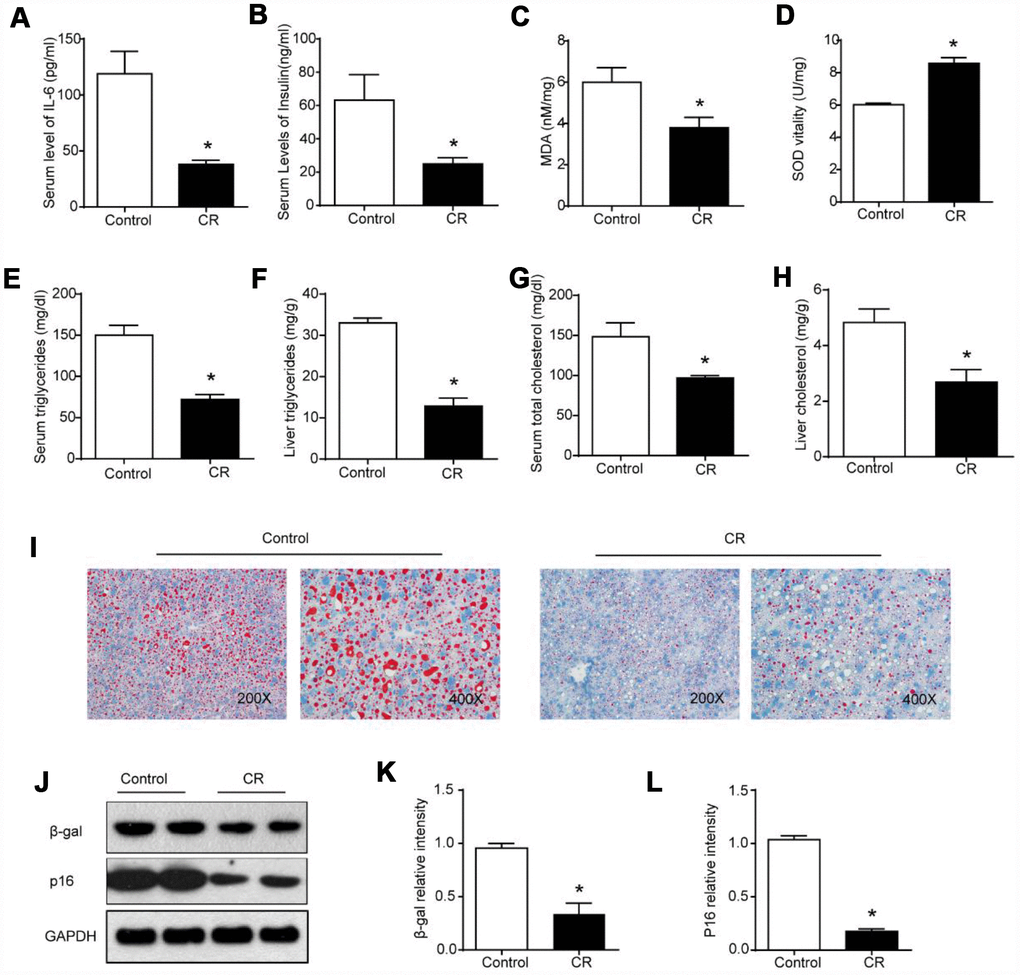 It has been well established that autophagy has a central role in the process of aging, as well as in all forms and at all stages of chronic liver disease [24]. Therefore, we analyzed LC3 and p62 to confirm whether the anti-aging effects of CR were modulated by autophagy. In CR mice, the LC3-II/I ratio increased significantly, while the level of p62 decreased, suggesting that CR promotes autophagy (Figure 2A, 2C, 2D). Given the critical role of mTOR signaling in autophagy, we examined whether CR influenced the activation of mTOR signaling. Our results showed that CR drastically diminished the phosphorylation of mTOR and the downstream S6K, indicating that mTOR signaling is involved in CR-induced autophagy (Figure 2A, 2E, 2F).