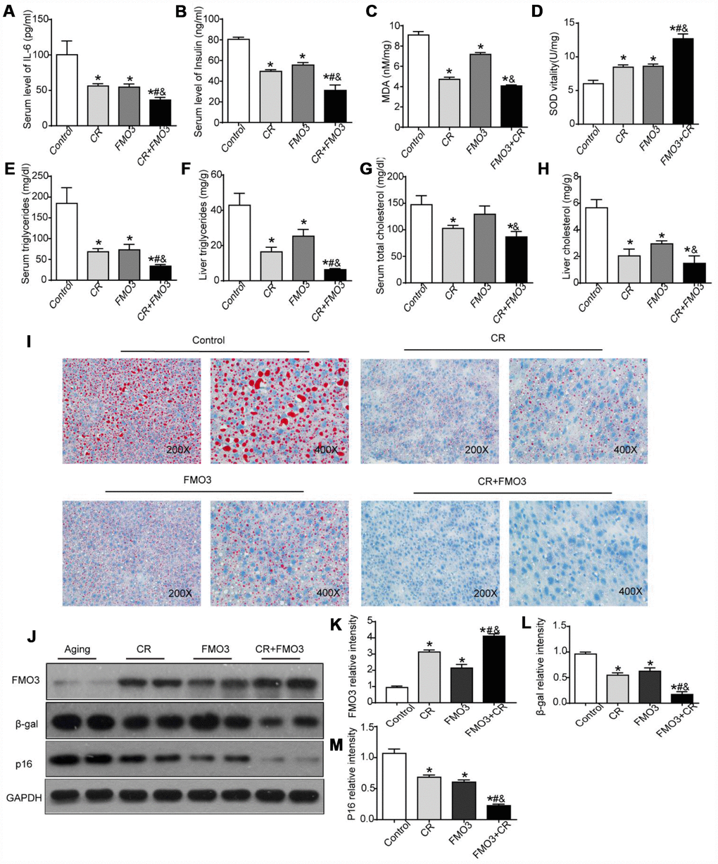 The incidence rates of lipid and glucose metabolic disorders increase with age and have been noted as characteristics of hepatic senescence, which involves a decline in hepatic function [27]. Our results showed that the overexpression of FMO3 ameliorated lipid and glucose metabolic disorders in the aging model to the same extent as CR. The overexpression of FMO3 reduced TG and TC levels both in serum and liver, and diminished lipid droplet accumulation in the liver as a result of improved hepatic function. It may also help prevent insulin resistance, based on the reduction of fasting serum insulin levels in the FMO3 overexpression group. Also, co-treatment with CR and FMO3 overexpression exerted a synergistic effect in the amelioration of lipid and glucose metabolic disorders.