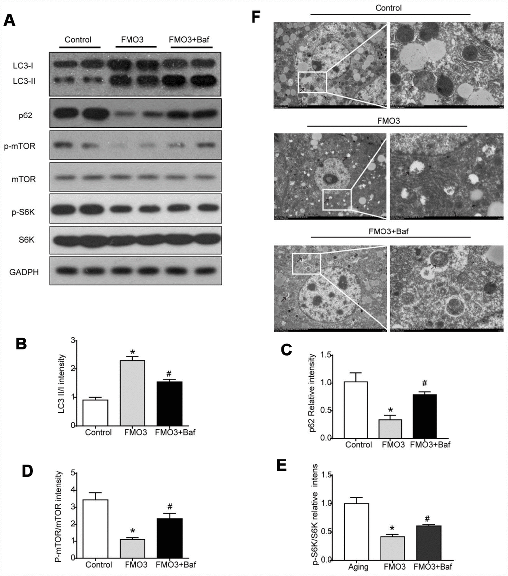To determine the role of autophagy specifically in the progress of FMO3-induced anti-aging effects on the liver, mice in the FMO3 overexpression group were intraperitoneally injected with a late-stage autophagy inhibitor, bafilomycin A1. The results were consistent with those obtained previously. As shown in Figure 5A–5C, compared with the control group, the FMO3 overexpression group exhibited an increased LC3II/LC3I ratio and decreased p62 content. Bafilomycin A1 is a late-stage autophagy inhibitor that prevents fusion between autophagosomes and lysosomes. The accumulation of LC3II and p62 indicated that autophagy degradation was inhibited successfully. Consistent with this, the FMO3 overexpression group also showed an immense increase in the number of autophagosomes, whereas the group receiving FMO3 overexpression combined with bafilomycin A1 treatment showed more accumulated autophagosomes than the single treatment group, resulting from the inhibition of autophagy in the late stage, as shown in the transmission electron microscopy images in Figure 5F. Notably, compared with the control group, reduced phosphorylation of mTOR and S6K was observed in the FMO3 overexpression group. Treatment with bafilomycin A1, however, abolished the FMO3-induced effects on mTOR/S6K signaling (Figure 5A, 5D, 5E).