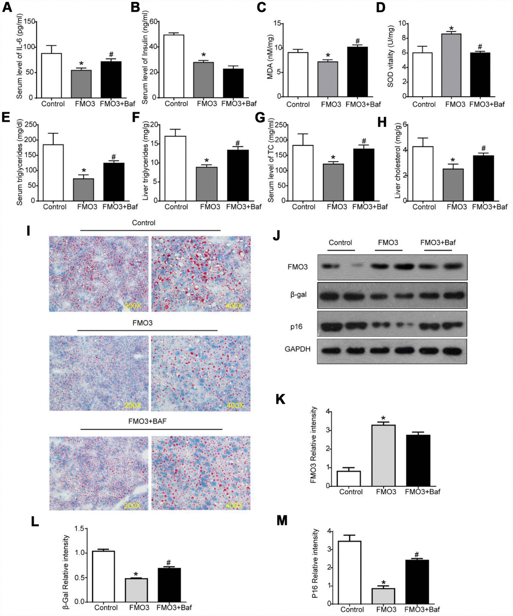 Next, we investigated whether autophagy inhibition by bafilomycin A1 treatment could reverse the FMO3-induced beneficial effects on the liver. As shown in Figure 6A, there was a conspicuous increase in serum levels of IL-6 in mice treated with both Ad-FMO3 and bafilomycin A1 compared with those treated with Ad-FMO3 alone. Serum levels of insulin, however, showed no significant changes after autophagy inhibition (Figure 6B). Mouse livers in the autophagy inhibition group exhibited markedly increased MDA and reduced SOD levels compared with the FMO3 overexpression group, indicating that bafilomycin A1 reversed the protective effect of FMO3 overexpression on oxidative stress in the liver (Figure 6C, 6D). As shown in Figure 6E–6H, bafilomycin A1 treatment greatly increased TG and TC levels in both serum and liver. Histologically, a notable reversion of the FMO3-induced reduction of lipid accumulation in the liver was also observed (Figure 6I) through Oil Red O staining of liver tissue. According to the western blot analysis, there were no significant differences in FMO3 protein expression levels between the groups with and without bafilomycin A1 treatment (Figure 6J, 6K). Levels of β-gal and p16 greatly increased following inhibition of autophagy by bafilomycin A1, compared with the FMO3 overexpression group without autophagy inhibition (Figure 6J, 6L–6N). Thus, the inhibition of autophagy abrogated the beneficial effects of the FMO3 overexpression intervention.