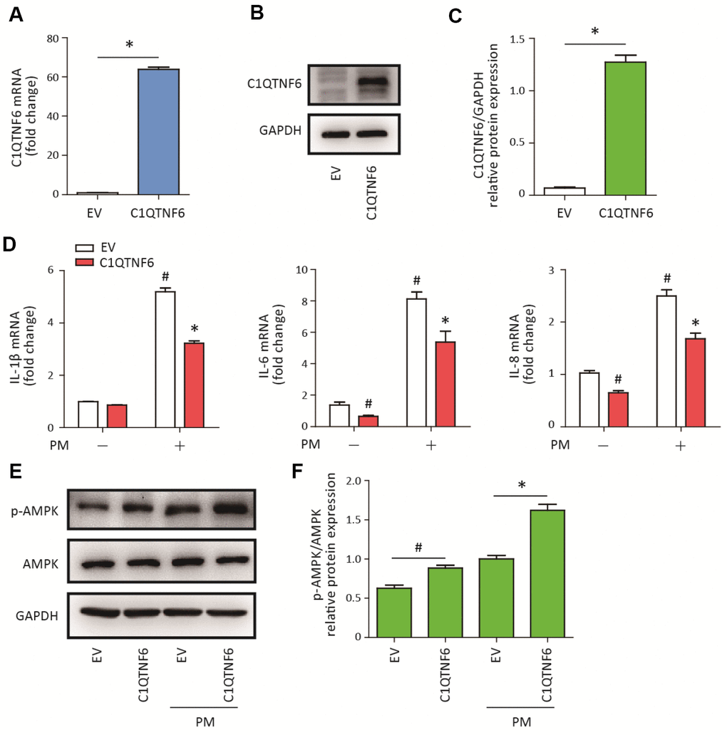 To determine the role of C1QTNF6 in PM-induced inflammatory responses in HBECs, C1QTNF6-overexpressing cells were constructed. RT-PCR and western blot analysis showed that C1QTNF6 was significantly upregulated at the mRNA and protein levels in the constructed HBECs (Figure 4A–4C). Next, C1QTNF6 overexpression decreased the expression of IL-6 and IL-8, but had no inhibitory effect on the expression of IL-1β, compared to the negative control cells. When HBECs were stimulated with PM, C1QTNF6 overexpression significantly inhibited PM-induced IL-1β, IL-6, and IL-8 expression in HBECs (Figure 4D). Furthermore, western blot results showed that C1QTNF6 overexpression in HBECs significantly promoted the activation of the AMPK signaling pathway compared to negative control cells exposed to PM (Figure 4E–4F). These results suggested that C1QTNF6 played a protective role in the PM-induced inflammatory responses.