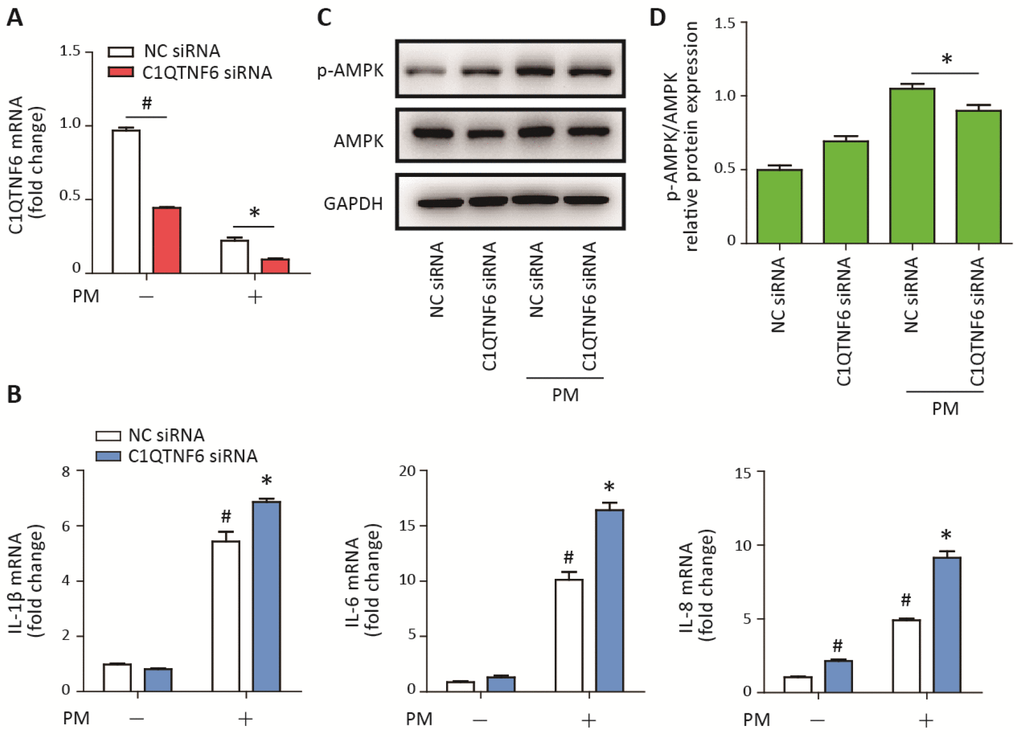 To further confirm the anti-inflammatory effect of C1QTNF6, C1QTNF6 siRNA was used to reduce the expression of C1QTNF6 in HBECs prior to PM exposure. The optimum C1QTNF6 siRNA was identified according to the inhibition efficiencies of three custom-designed siRNAs using RT-PCR (Supplementary Figure 3). Moreover, RT-PCR showed that C1QTNF6 siRNA significantly inhibited the expression of C1QTNF6 in HBECs with or without PM exposure (Figure 5A). C1QTNF6 inhibition increased the expression of IL-8, but had no effect on the expression of IL-1β and IL-6, compared to the negative control (Figure 5B). When cells were stimulated with PM, C1QTNF6 inhibition significantly potentiated PM-induced IL-1β, IL-6, and IL-8 expression in HBECs (Figure 5B). Additionally, western blot results showed that the AMPK signaling pathway was inhibited by C1QTNF6 silencing in HBECs exposed to PM, compared to the negative control (Figure 5C, 5D). These data further confirmed that C1QTNF6 was an anti-inflammatory molecule in PM-induced inflammatory responses.