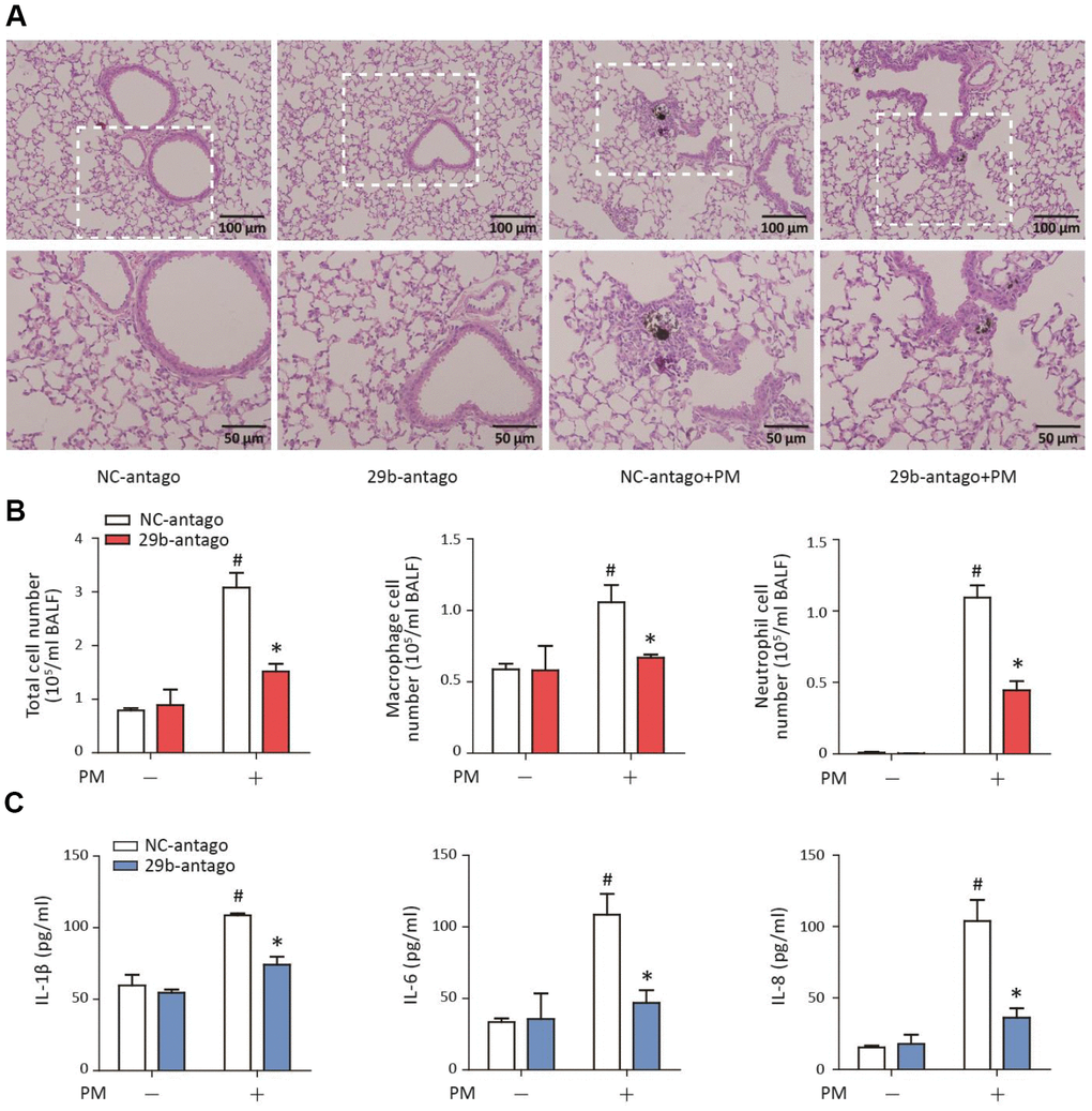 To determine the role of miR-29b-3p in the PM-induced acute lung inflammatory responses in vivo, miR-29b-3p antagomirs (29b-antago) or negative control antagomirs (NC-antago) were injected via the tail vein prior to PM exposure in mice. Histopathologic analyses showed that 29b-antago attenuated acute inflammatory responses and reduced inflammatory cells infiltration around PM deposits in the lung tissues of mice (Figure 6A). In accordance with the histological analysis, the numbers of total cells, macrophages and neutrophils were significantly reduced in the BALF of PM-exposed mice treated with 29b-antago compared to NC-antago (Figure 6B). Additionally, 29b-antago treatment significantly abolished the PM-induced IL-1β, IL-6, and IL-8 secretion in the bronchoalveolar lavage fluid (BALF) of mice (Figure 6C). These results suggested that inhibition of miR-29b-3p protected against the PM-induced acute lung inflammatory responses in vivo.