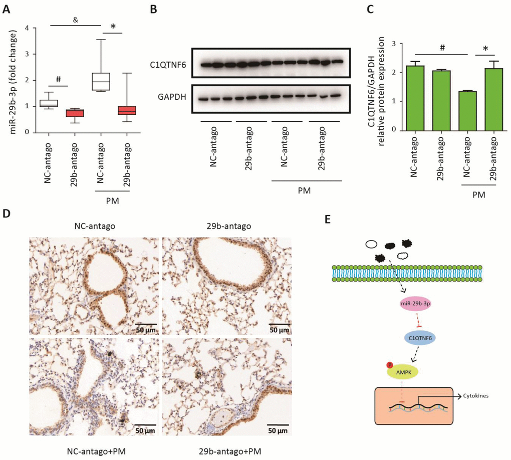 In summary, we firstly found that miR-29b-3p was significantly upregulated by PM exposure in airway epithelial cells and alveolar macrophages and miR-29b-3p promoted the expression of pro-inflammatory cytokines (IL-1β, IL-6, and IL-8) both in vivo and in vitro. Furthermore, miR-29b-3p could directly target C1QTNF6 and thereby inhibited the activation of the anti-inflammatory AMPK signaling pathway during PM-induced inflammatory responses. These results showed, for the first time, that miR-29b-3p served as a vital modulator in PM-induced inflammatory responses, which revealed a new biological mechanism underlying the adverse PM-induced health effects. Moreover, these findings indicated that miR-29b-3p might be a novel therapeutic target for the treatment of adverse PM-induced respiratory effects in the future.