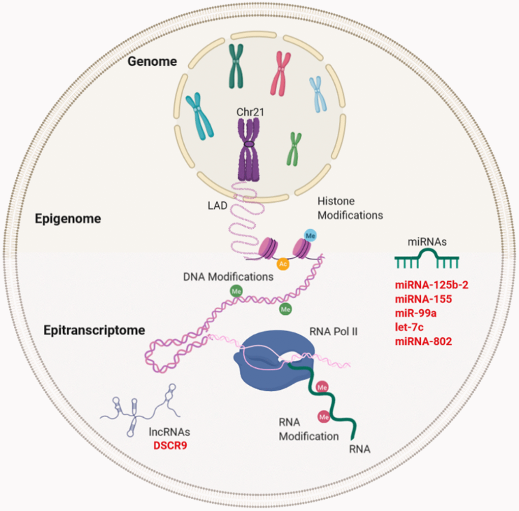 In addition to the pathological characteristics linked to DS and AD mentioned above, different epigenetic modifications that participate in neurological defects have been identified, mediating brain development and synaptic plasticity [128], further increasing the complexity associated with both pathologies. These epigenetic mechanisms include DNA methylation, chromatin remodeling, nuclear reorganization, but also specific and direct modifications in RNA transcripts, which may influence the final functional roles of different coding and ncRNAs (Figure 3).