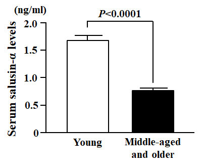 In the cross-sectional study, body mass index (BMI), carotid-femoral PWV (cfPWV), systolic blood pressure (SBP), diastolic blood pressure (DBP), mean blood pressure (MBP), common carotid intima-media thickness (ccIMT) and the levels of total cholesterol and triglycerides were significantly greater in the Middle-aged and older group than in the Young group (Table 1). In contrast, height and serum salusin-α levels in the middle-aged and older group were significantly lesser than in the young group (Table 1 and Figure 1).