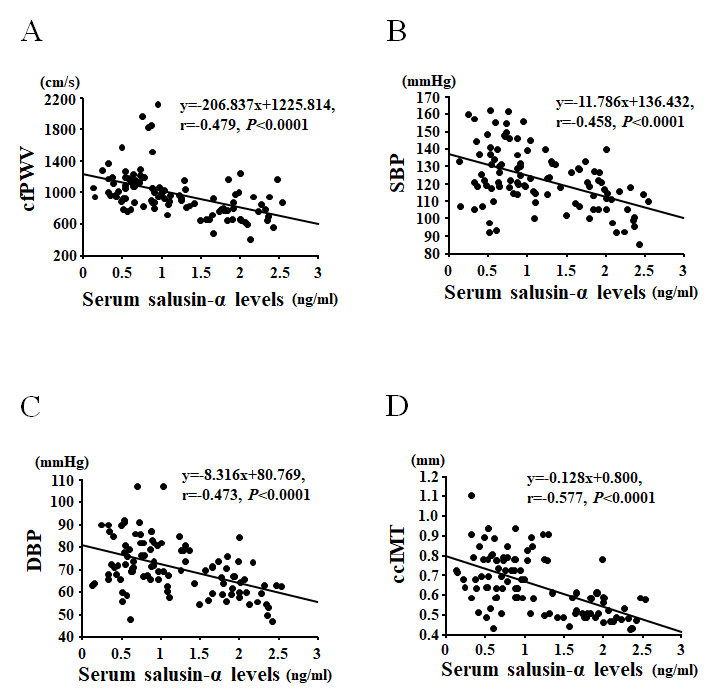 Serum salusin-α levels were negatively correlated with 1) age (r = -0.698, P < 0.0001); 2) total cholesterol (r = -0.374, P < 0.0001); 3) triglycerides (r = -0.336, P < 0.001); 4) SBP (r = -0.458, P < 0.0001); 5) DBP (r = -0.473, P < 0.0001); 6) MBP (r = -0.486, P < 0.0001); 7) cfPWV (r = -0.479, P < 0.0001); 8) ccIMT (r = -0.577, P < 0.0001) (Table 2 and Figure 2). In the multiple regression analysis using serum salusin-α levels as the dependent variable, MBP (β = -0.277, P < 0.05) and cfPWV (β = -0.299, P < 0.05) were independent factors associated with serum salusin-α levels. However, BMI and triglycerides were not independently associated with serum salusin-α levels.
