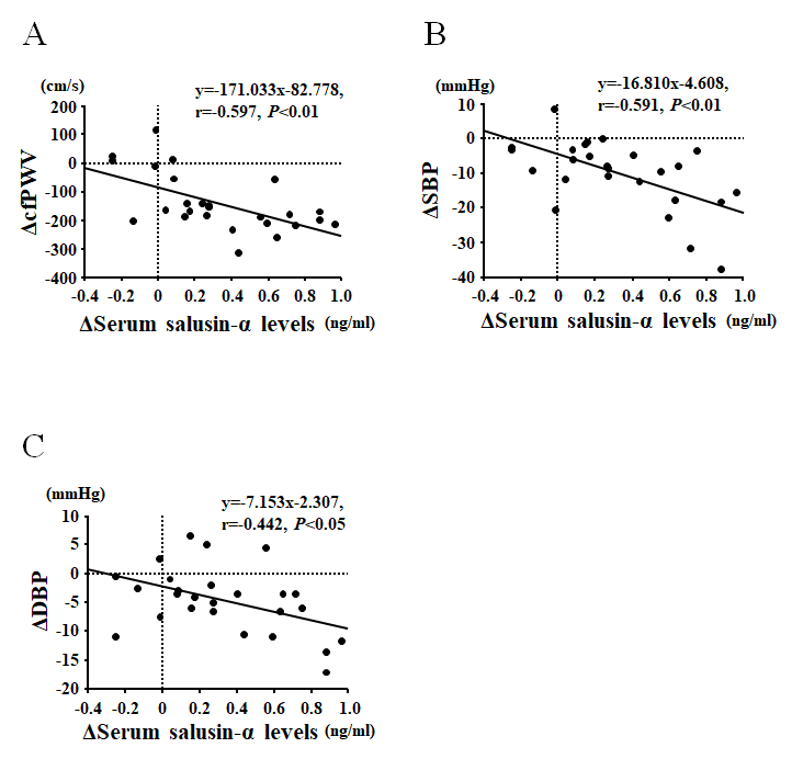 Data are expressed as means ± SE. In the cross-sectional study, unpaired Student’s t-tests were used to compare young versus middle-aged and older subjects for all parameters measured. Pearson correlation coefficients were used to assess the relationships between serum salusin-α levels with all other parameters obtained in this study. A multiple linear regression analysis was used to to test the independent association of serum salusin-α levels with BMI, triglyceride level, MBP, cfPWV. In the interventional study, unpaired Student’s t-tests were used to compare any parameter changes that occurred before and after the exercise intervention between the AT and control groups. As in the cross-sectional study, Pearson correlation coefficients were used to assess the relationships between serum salusin-α levels and the other parameters measured in all four groups of the interventional study. The partial correlation coefficient between serum salsuin-α levels and cfPWV, SBP or DBP was adjusted for age. A value of P < 0.05 was considered as statistically significant. All statistical analyses were performed using StatView (5.0, SAS Institute, Tokyo, Japan).