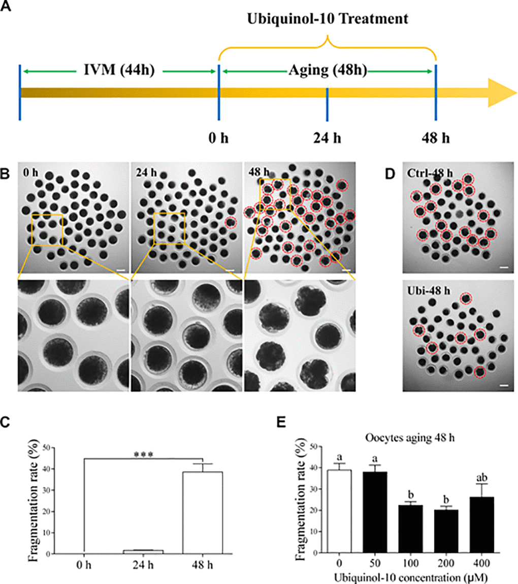 After removing cumulus cells by repeated pipetting in 1 mg/mL hyaluronidase, only oocytes with first polar bodies were used for subsequent studies. For postovulatory oocyte aging, the collected MII oocytes were cultured in fresh in vitro maturation medium (IVM, mineral oil-covered) with or without ubiquinol-10 for an additional 24 or 48 h at 38.5°C in a humidified atmosphere (5% CO2). The fragmentation rate was checked at 24 and 48 h after aging in vitro.