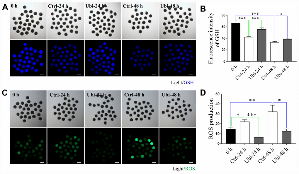 To determine the antioxidant protection effects of ubiquinol-10 on in vitro aging oocytes, the GSH and ROS levels were detected by the CMF2HC and H2DCF-DA reactions, respectively. As shown in Figure 2A and 2B, oocyte GSH levels gradually decreased during oocyte aging in vitro (p < 0.001). However, GSH levels in ubiquinol-10-treated oocytes were higher than those in oocytes not treated with ubiquinol-10 at both 24 and 48 h of aging (p < 0.05). ROS production substantially increased from 0 to 48 h in the aging oocytes in vitro (p < 0.05). However, ROS levels in the ubiquinol-10-treated oocytes were significantly lower than those in the control oocytes at both 24 and 48 h of aging (p < 0.05, Figure 2C and 2D). These data suggest that ubiquinol-10 can prevent GSH reduction and ROS production.
