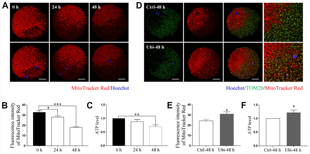 MitoTracker Red CMXRos was used to detect mitochondrial activity. As shown in Figure 3A and 3B, mitochondrial activity was significantly decreased during in vitro aging (p < 0.05). After 48 h of aging, the mitochondrial activity reduced by approximately 45% of the normal levels (p < 0.001). The ATP level was also measured as an estimate of mitochondrial function. As shown in Figure 3C, although the ATP level was not decreased after 24 h of in vitro aging (p > 0.05), it had considerably decreased after 48 h of aging in vitro (p < 0.01). Thus, to assess whether ubiquinol-10 could have beneficial effects on mitochondria during postovulatory aging of oocytes, oocytes were treated with ubiquinol-10 for 48 h during aging in vitro before measurement of mitochondrial activity and ATP levels. The results showed that the aging-induced reduction in mitochondrial activity and ATP level was noticeably prevented by the addition of ubiquinol-10 (p < 0.05, Figure 3D–3F). These findings indicate that ubiquinol-10 had protective effects on mitochondria of oocytes during postovulatory aging.